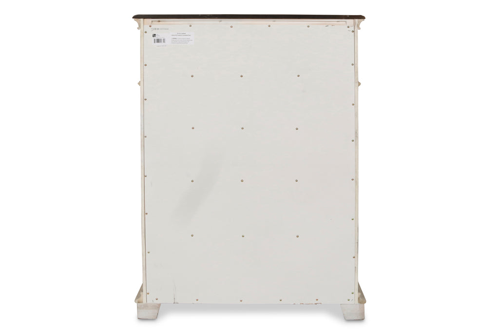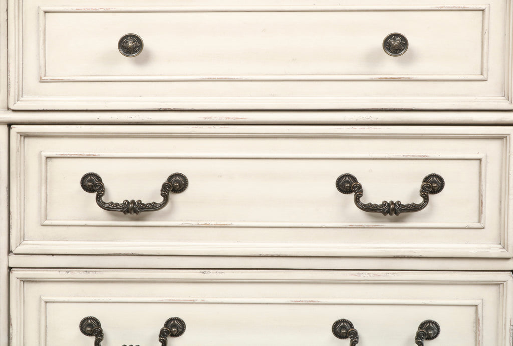 Complete your bedroom ensemble with the New Classic Furniture Anastasia 5 Drawer Chest in Antique White, a testament to real wood craftsmanship with solid poplar and oak veneer for enduring durability. The heirloom finish, achieved through a meticulous multi-step process involving wire brushing, clefts, rasping, threading, and rub throughs, grants each chest an upscale, vintage look, ensuring that no two pieces are exactly alike. The creamy off-white stain, enriched with brown and gray burnishing, radiates vintage French country cottage charm, accentuated by a rustic brown finish top that encapsulates the antique, old-world charm. The chest's graceful composition is defined by picture frame drawer fronts, bracket feet, detailed crown molding aprons, and chamfered panel appliques, complemented by antique gold drop ball drawer pulls. Drawer operation is effortless with ball-bearing glides, providing a smooth and easy open performance. Enjoy clean and carefree storage with all drawers sanded and sealed, and top drawers lined with felt to safeguard delicates, watches, jewelry, and glasses. The bottom drawers are cedar-lined, offering a cozy haven for sweater storage. The time-tested quality is evident in the four-corner English dovetail joinery, ensuring a strong and durable piece of furniture.