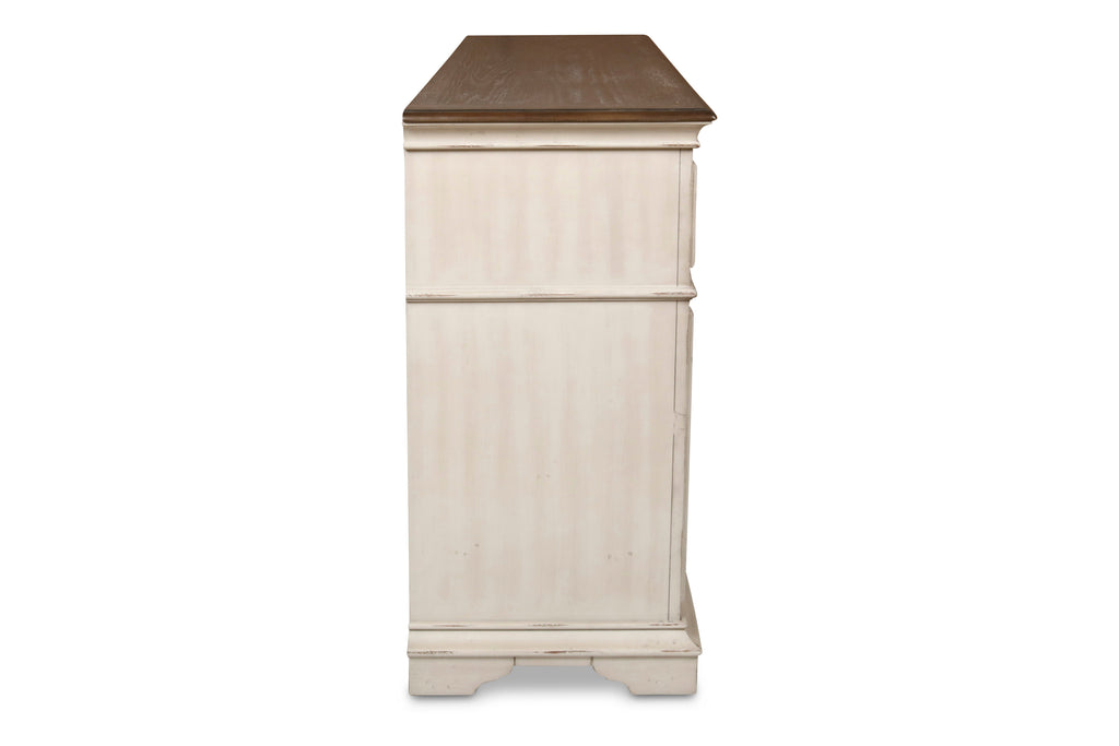 Complete your bedroom with the New Classic Furniture Anastasia 7 Drawer Dresser, a testament to real wood craftsmanship with solid poplar and oak veneer for enduring durability. The heirloom finish, achieved through a meticulous multi-step process involving wire brushing, clefts, rasping, threading, and rub throughs, grants each dresser an upscale, vintage look, ensuring that no two pieces are exactly alike. The creamy off-white stain, enriched with brown and gray burnishing, radiates vintage French country cottage charm, harmonized by a rustic brown finish top that encapsulates the antique, old-world charm. The dresser's graceful composition is defined by picture frame drawer fronts, bracket feet, detailed crown molding aprons, and chamfered panel appliques, complemented by antique gold drop ball drawer pulls. Drawer operation is effortless with ball-bearing glides, providing a smooth and easy open performance. Enjoy clean and carefree storage with all drawers sanded and sealed, and top drawers lined with felt to safeguard delicates, watches, jewelry, and glasses. The bottom drawers are cedar-lined, offering a cozy haven for sweater storage. The time-tested quality is evident in the four-corner English dovetail joinery, ensuring a strong and durable piece of furniture. Rest easy knowing that this dresser complies with safety standards, delivering a secure and stylish storage solution.