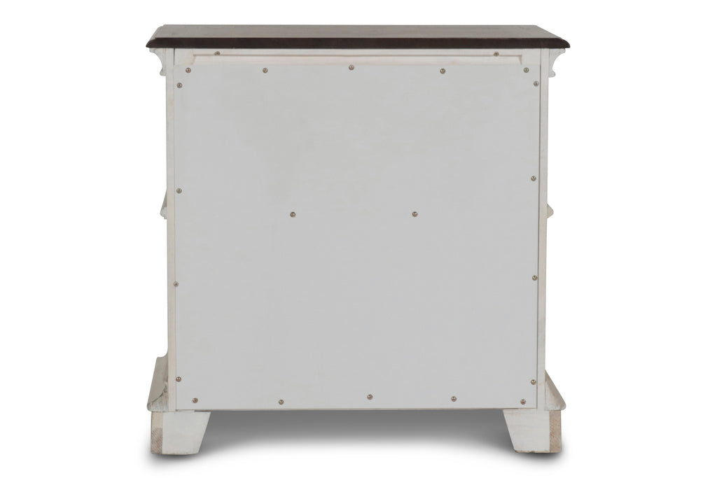 Complete your bedroom ensemble with the New Classic Furniture Anastasia 2 Drawer Nightstand. Crafted with real wood construction from solid poplar and oak veneer, this nightstand ensures long-lasting durability. The heirloom finish, achieved through a multi-step process involving wire brushing, clefts, rasping, threading, and rub throughs, delivers an upscale, vintage look where no two pieces are alike. The creamy off-white stain, enhanced with brown and gray burnishing, exudes vintage French country cottage charm, accentuated by a rustic brown finish top for an antique, old-world appeal. The graceful composition includes picture frame drawer fronts, bracket feet, detailed crown molding aprons, and chamfered panel appliques, adorned with antique gold drop ball drawer pulls. Effortless drawer operation with ball bearing glides ensures smooth and easy access. The nightstand offers clean and carefree storage with sanded and sealed drawers, and the top drawer is lined with felt to protect delicate items. Time-tested quality is evident in the four-corner English dovetail joinery, providing a strong and durable piece of furniture. Rest easy knowing that this nightstand complies with safety standards, offering a secure and stylish addition to your bedroom. With a 1-year limited warranty, it's a practical and charming choice for your nighttime essentials.