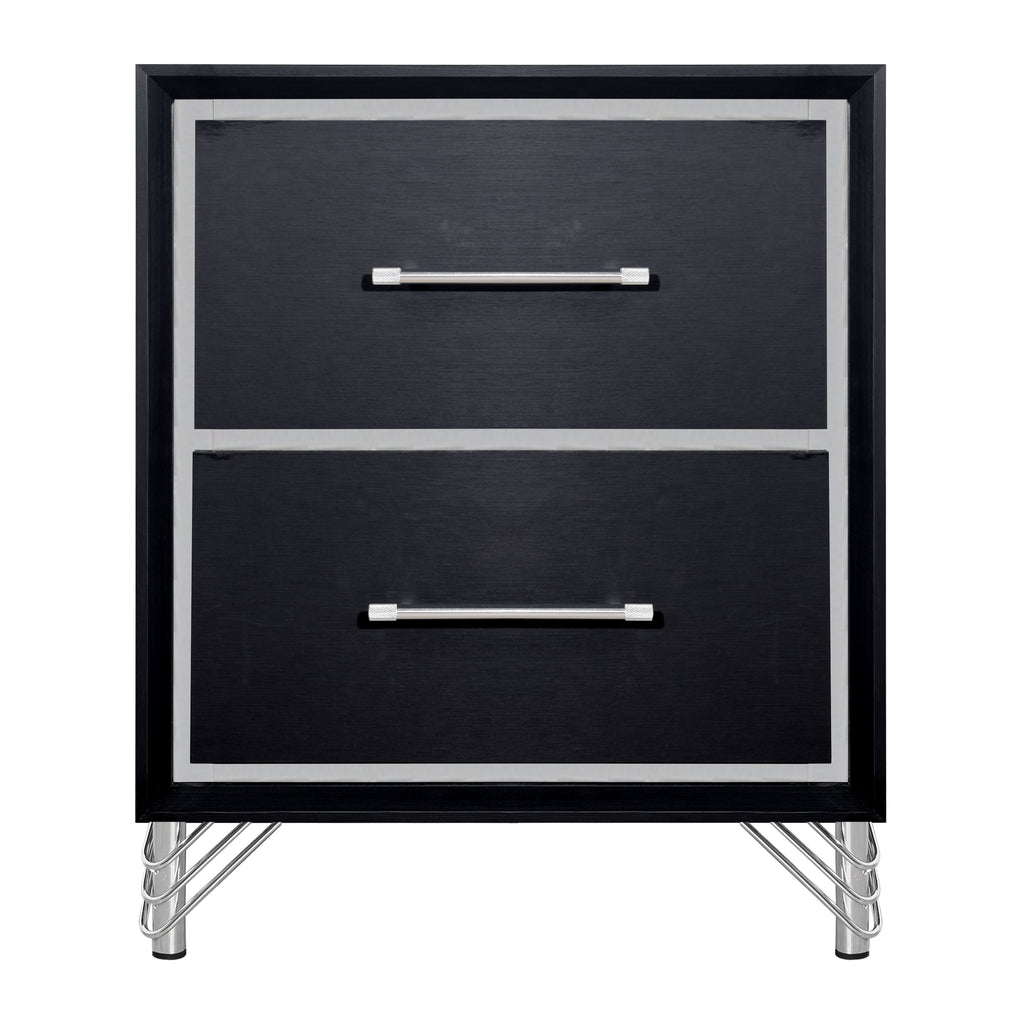 The Ava 2 Drawer Nightstand in Ebony blends modern glamour with everyday functionality. Crafted from engineered wood with eco-friendly black laminate, it features silver mylar accents and sculpted legs for a chic finish. Two spacious drawers offer smooth operation with English dovetail joinery and Kenlin ball-bearing glides. A stylish and practical piece that adds a touch of sophistication to any bedroom.