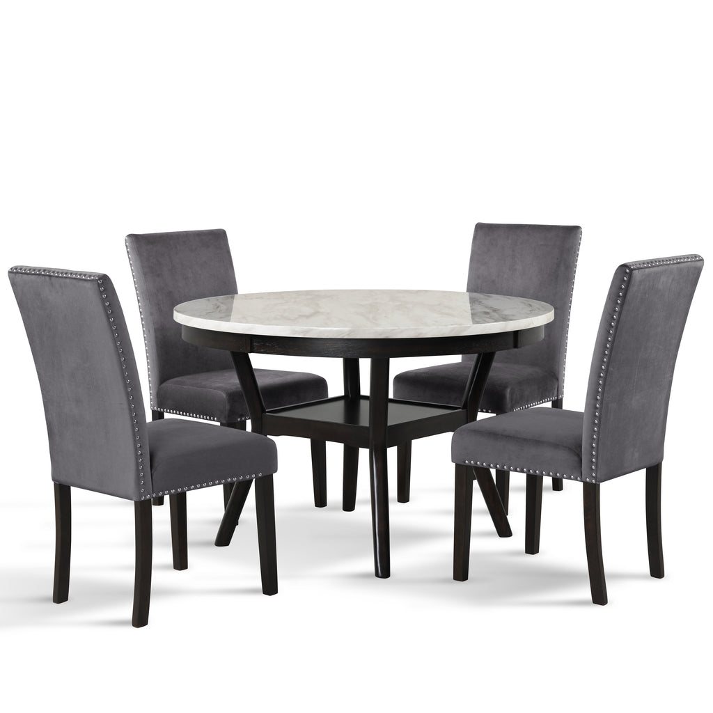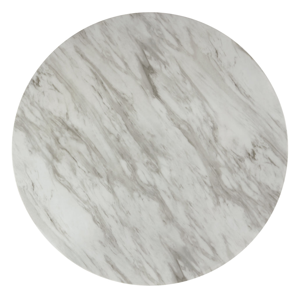 The 48” Round Celeste Dining Table is meticulously crafted for enduring quality with solid Rubberwood legs and durable manufactured wood components. The heat and water-resistant faux marble top, finished with a glossy coat, not only adds a touch of contemporary glamour but also ensures effortless cleaning and protection from daily wear. The sleek white surface with gray veining perfectly complements the deep espresso base, creating a modern ambiance for your space. Invest in this quality-built, heat, and water-resistant Celeste dining table to seamlessly blend style and practicality in your home.