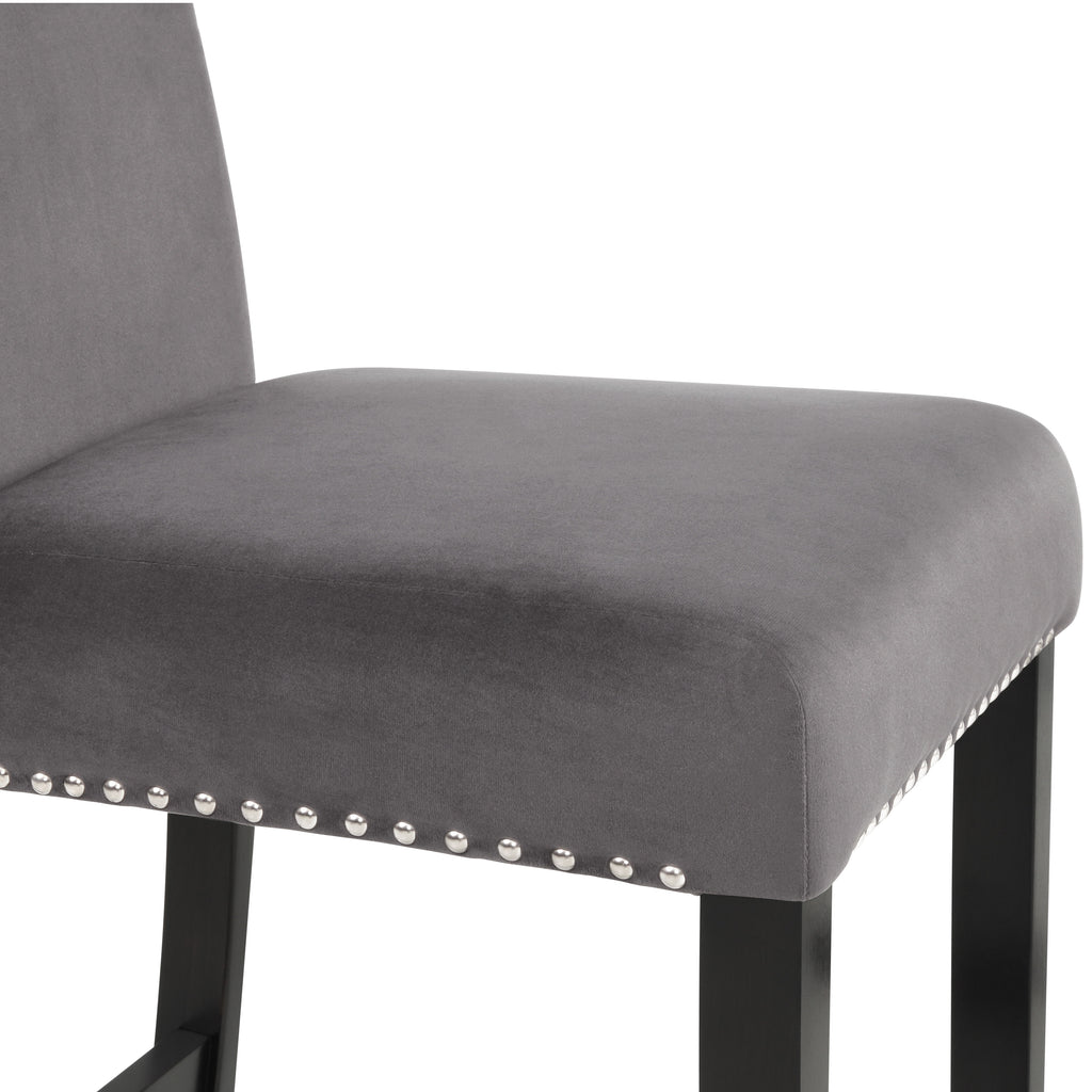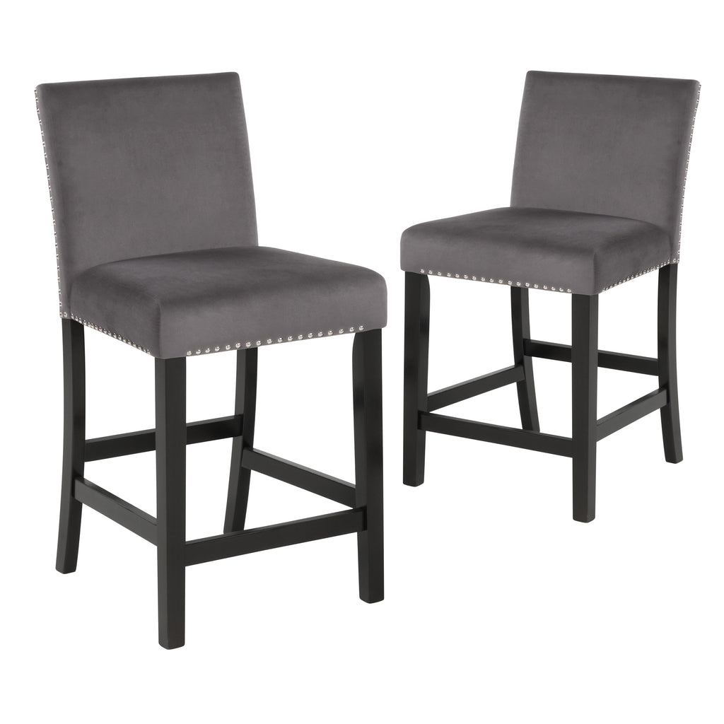 Introducing the New Classic Furniture Celeste Counter Dining Chair – a set of two chairs designed to combine style, comfort, and durability seamlessly. Crafted with solid Rubberwood legs and base stretchers that double as footrests, these counter chairs ensure a strong and stable seating solution for your elevated dining experience. The 100% polyester gray velvet upholstery covers sumptuous memory foam cushions, offering both softness and durability for an easy-care, luxurious seat. The espresso legs, paired with glimmering silver nailhead trim, add a touch of contemporary glamour to the plush velvet seating. Setting up these counter chairs is a hassle-free experience with the included easy-to-follow assembly instructions. Elevate your dining space with the Celeste Counter Dining Chair – where quality construction meets comfort and modern style effortlessly.