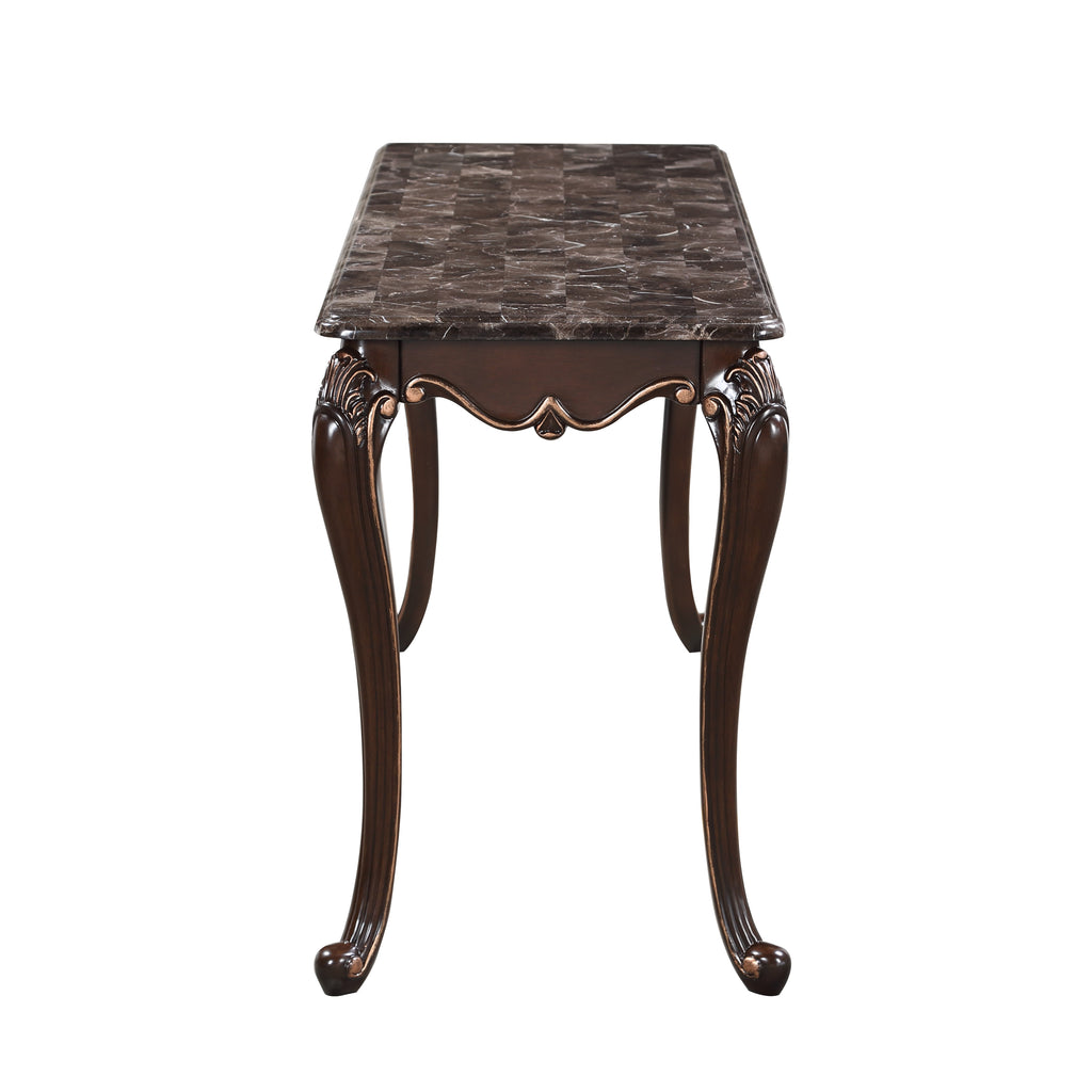The Royal Classics Constantine Sofa Table / Entry Table in cherry is a perfect blend of heirloom quality and elegant design, making it a refined addition to any entryway or living space. Expertly crafted from solid pine and featuring premium polyurethane carving details, this table offers both timeless beauty and exceptional durability. The lightweight yet robust carvings are resistant to moisture, rot, and cracking, ensuring intricate detailing remains flawless with minimal maintenance. The meticulous multi-step finish enhances the rich grain of the wood, while burnished gold tipping adds a touch of luxury to the intricate carvings. Inspired by 18th-century Rococo design, the table's ornate details bring a sense of regal sophistication to your home. Sophisticated touches like the genuine marble top, bowfront drawers, and gracefully curved cabriole legs complete the lavish look, making this table a perfect combination of style and functionality. Ideal for showcasing decor or as a statement piece, it enhances any room with its elegance and practicality.