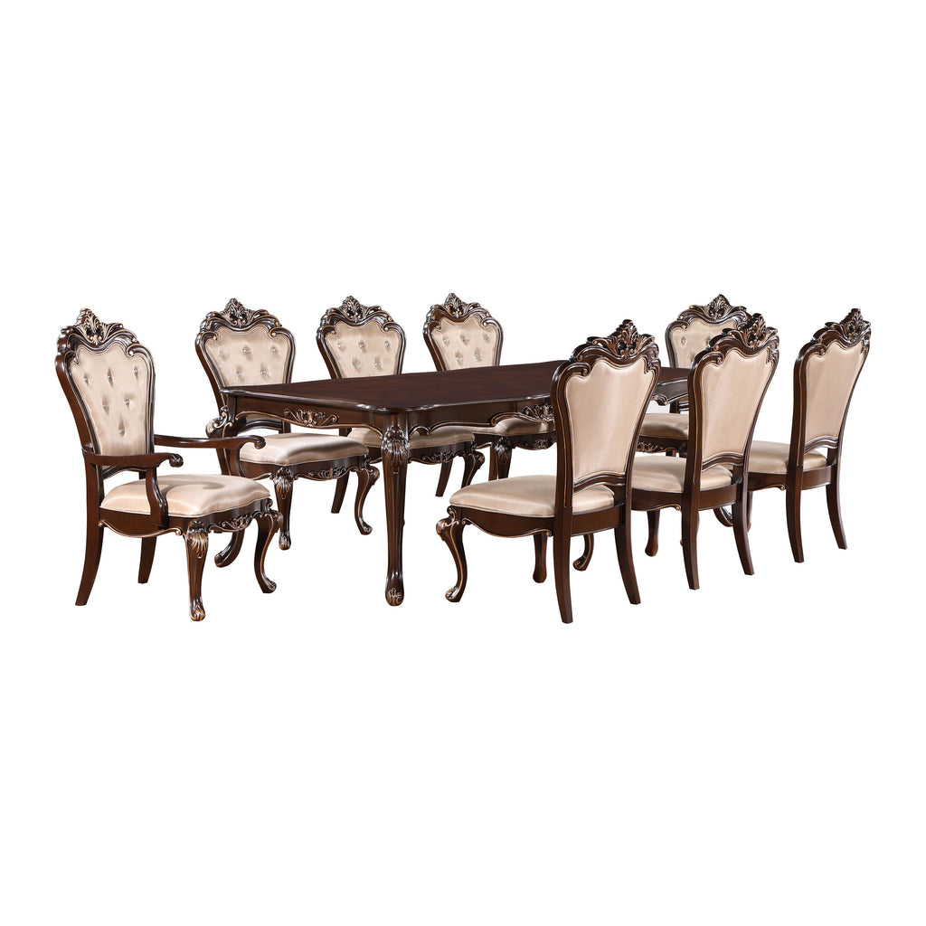 The Royal Classics Constantine Dining Side Chairs (Set of 2) in cherry combine heirloom craftsmanship with timeless design, making them an elegant addition to any dining room. Expertly crafted from solid pine and premium fancy face birch veneers, these chairs offer both beauty and durability for years to come. The meticulous multi-step finish enhances the natural wood grain, while delicately burnished gold tipping highlights the intricate carvings, adding a touch of luxury to the overall design. Drawing inspiration from 18th-century Rococo style, these chairs feature ornate carvings that bring an air of regal elegance to your home. Upholstered in luxurious 100% polyester sateen fabric, the crystal button-tufted backs and cushions provide both sophisticated style and supportive comfort, making these chairs fit for royalty. Ideal for creating a refined and comfortable dining experience, this set blends beauty and practicality seamlessly.
