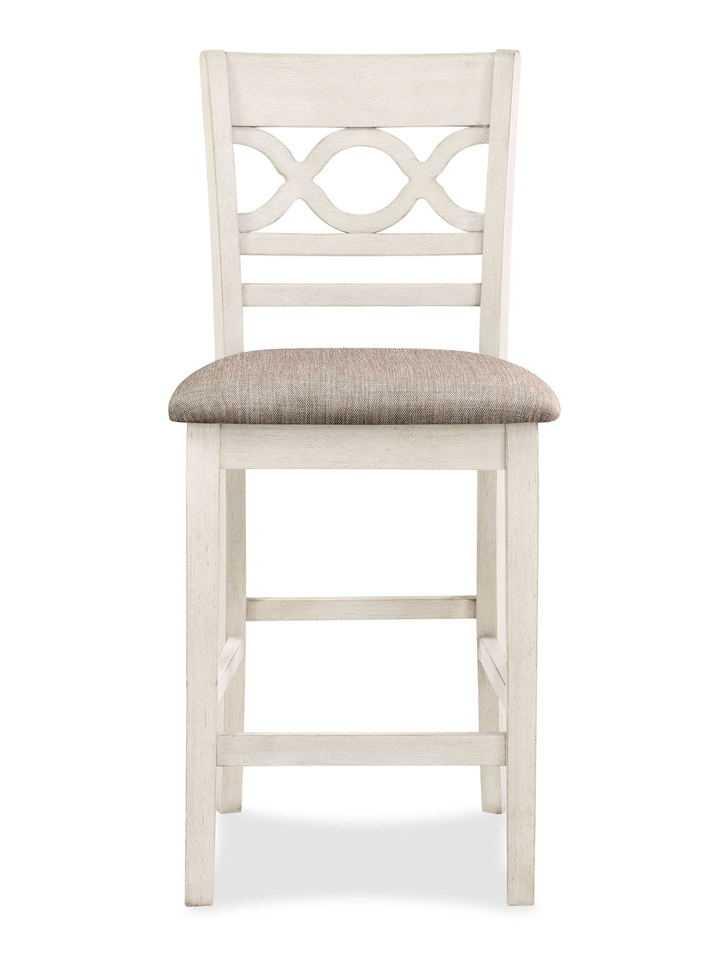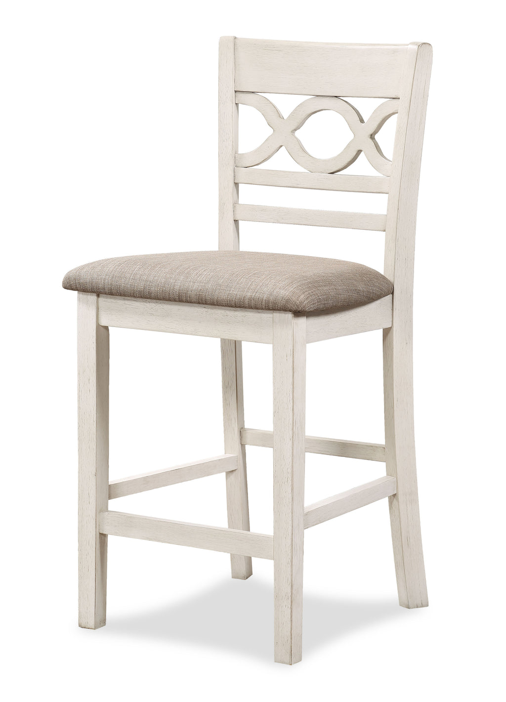 The farmhouse appeal of the Cori 5 Piece Counter Dining Table and Chair Set is beautifully created with durability and comfort in mind. This dining set provides spacious seating for four and 2 handy storage shelves located under the table top to display dinnerware or decor. The dining table apron, table legs and dining chair legs are crafted of solid Rubberwood to add strength and stability. The distinctive reverse diamond Mindi wood veneer dining table top accents the beautiful wood grains. A multi-step vintage brown table top and creamy bisque chairs and table base create the heirloom appeal of this family gathering table. The set includes four comfortable dining chairs with 100% polyester light brown seat cushions. The final touch is Cori's signature interlocking chain design on the chair back, giving this dining set a touch of distinction at home in your dining room or kitchen.