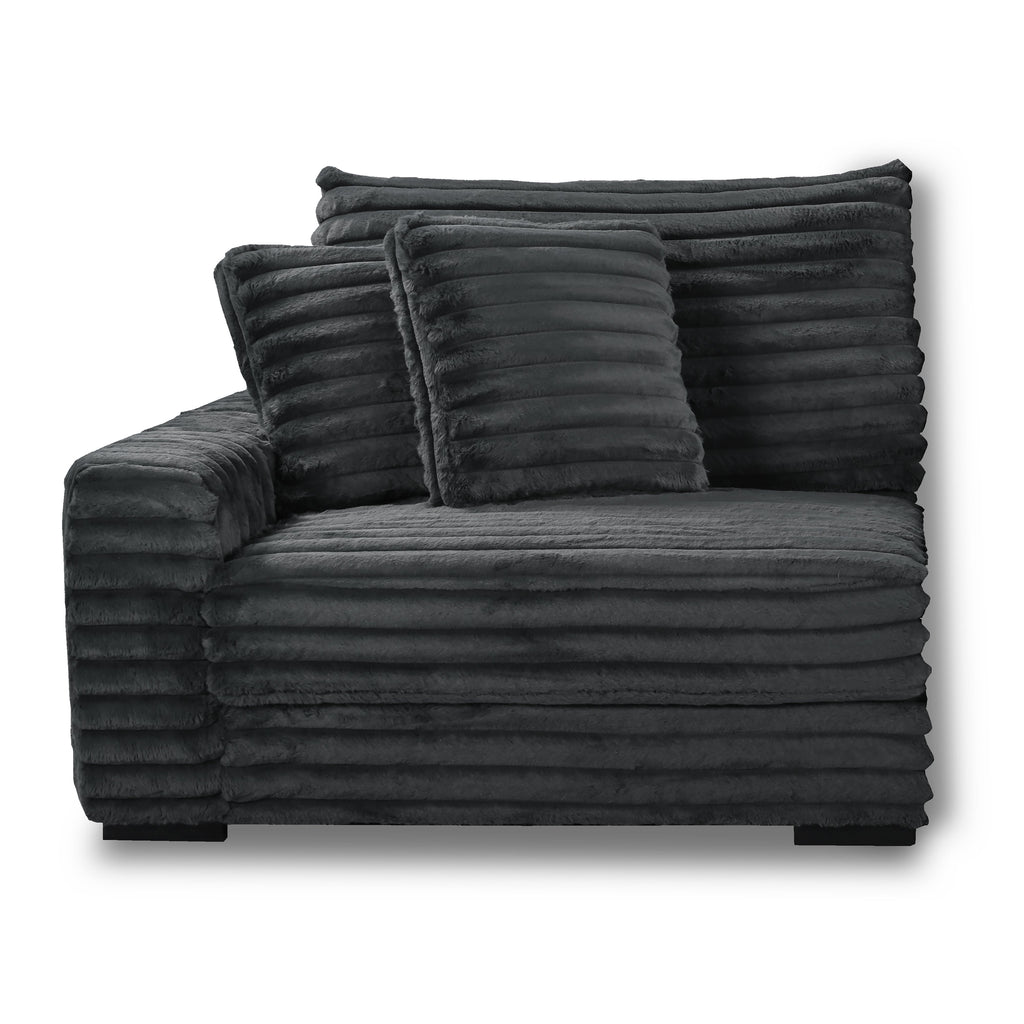 The Embrace Left Arm Facing Chair with 2 Accent Pillows in charcoal gray is a sophisticated and comfortable addition to your sectional arrangement. Featuring 100% charcoal gray polyester fabric with a fluffy, blanket-like texture, this chair promises ultimate relaxation. It includes two plush accent pillows that enhance its luxurious ribbed channel fabric. The high-density, resilient foam cushions provide supportive seating, ensuring a cozy lounging experience. Constructed with a strong and durable frame made from a combination of solid and manufactured woods, this chair offers long-lasting quality. Its versatile, transitional styling makes it a seamless fit with the rest of the Embrace collection, inviting you to lounge and unwind in unparalleled comfort. Perfect for use with the Embrace Sectional, this chair is designed to complete your living space with both style and function.