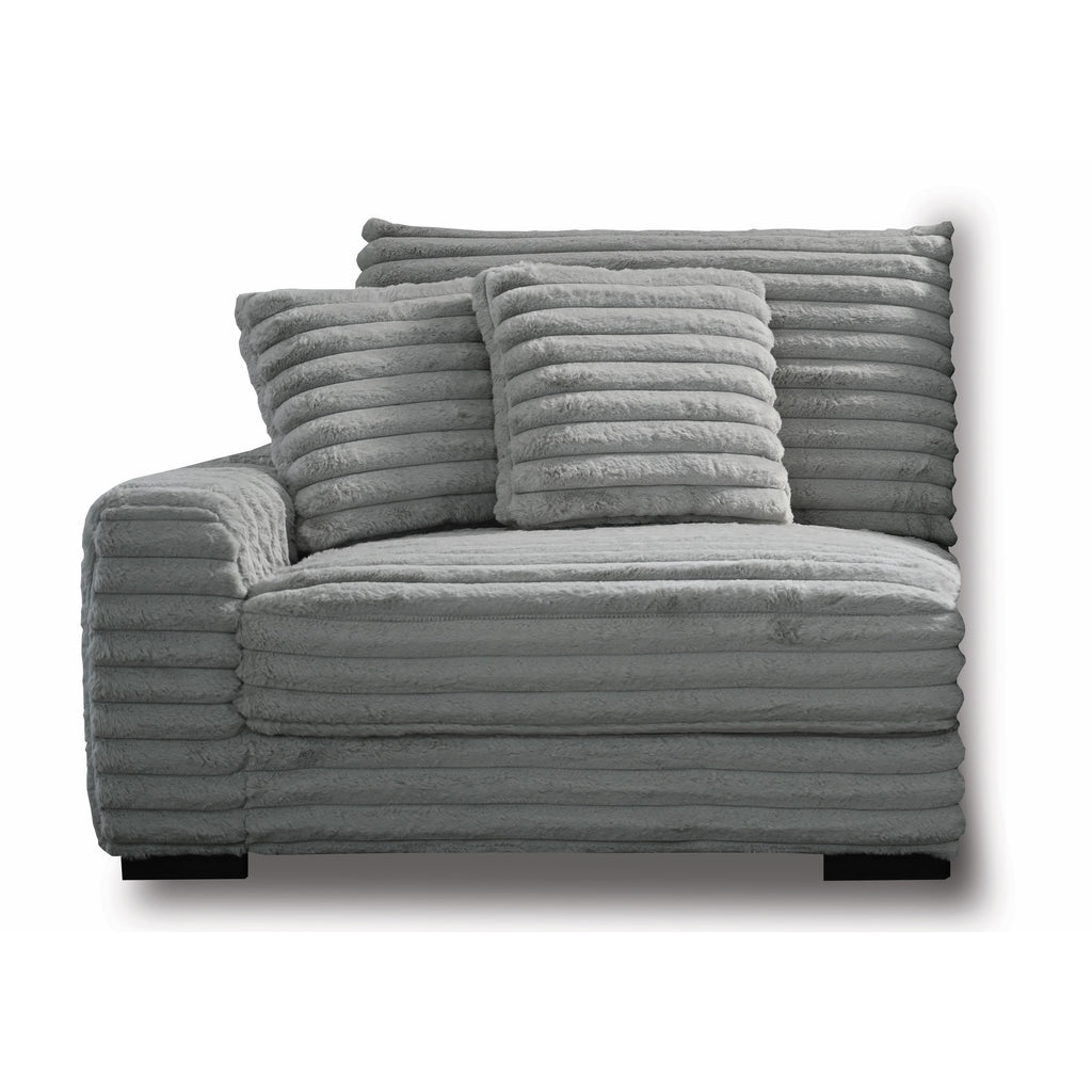 The Embrace Left Arm Facing Chair with 2 Accent Pillows in gray is a sophisticated and comfortable addition to your sectional arrangement. Featuring 100% gray polyester fabric with a fluffy, blanket-like texture, this chair promises ultimate relaxation. It includes two plush accent pillows that enhance its luxurious ribbed channel fabric. The high-density, resilient foam cushions provide supportive seating, ensuring a cozy lounging experience. Constructed with a strong and durable frame made from a combination of solid and manufactured woods, this chair offers long-lasting quality. Its versatile, transitional styling makes it a seamless fit with the rest of the Embrace collection, inviting you to lounge and unwind in unparalleled comfort. Perfect for use with the Embrace Sectional, this chair is designed to complete your living space with both style and function.