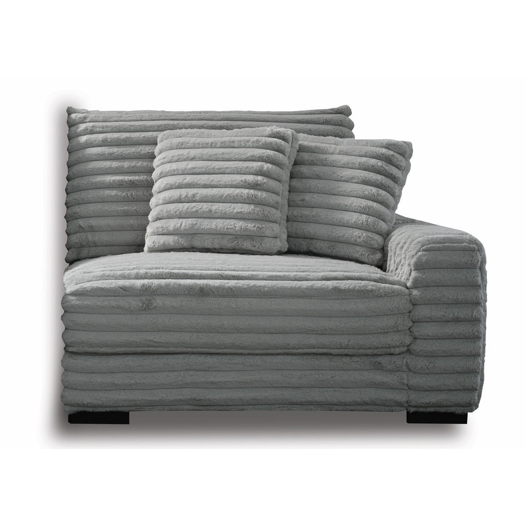 The Embrace Right Arm Facing Chair with 2 Accent Pillows in gray is a sophisticated and comfortable addition to your sectional arrangement. Featuring 100% gray polyester fabric with a fluffy, blanket-like texture, this chair promises ultimate relaxation. It includes two plush accent pillows that enhance its luxurious ribbed channel fabric. The high-density, resilient foam cushions provide supportive seating, ensuring a cozy lounging experience. Constructed with a strong and durable frame made from a combination of solid and manufactured woods, this chair offers long-lasting quality. Its versatile, transitional styling makes it a seamless fit with the rest of the Embrace collection, inviting you to lounge and unwind in unparalleled comfort. Perfect for use with the Embrace Sectional, this chair is designed to complete your living space with both style and function.