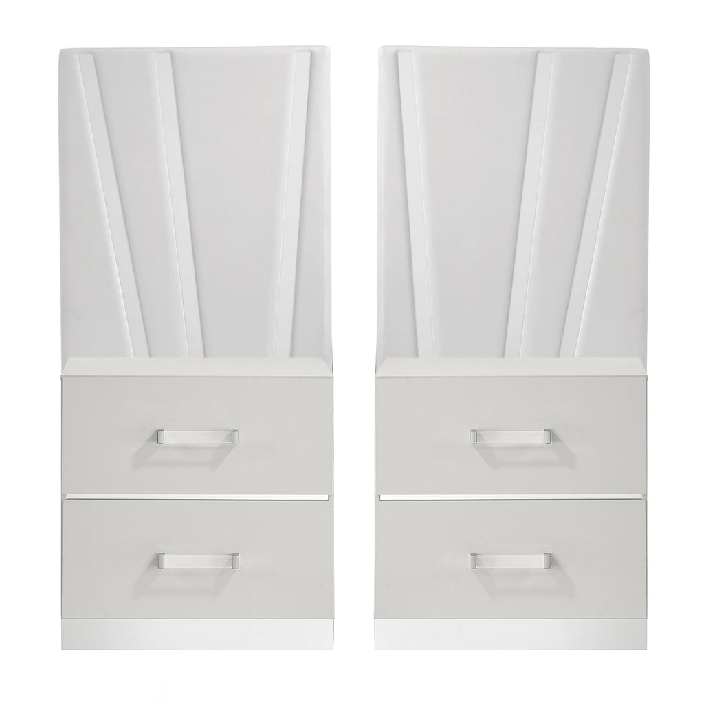 The Europa decorative back panels are designed for use with the Europa Nightstand. The Europa's sophisticated look is achieved through a gleaming white finish, mylar accents, and acrylic drawer pulls. Quality craftsmanship is evident in the eco-friendly manufactured woods, assembled for durability, with surfaces finished in a glossy white topcoat and padded upholstery. Upscale extras include silver mylar pedestal bases and decorative panel accents, enhancing the glamour of these nightstands. The sturdy, well-constructed drawers feature dovetail joinery and ball bearing glides for a durable, easy-glide operation, with interiors finished for snag-free storage. The two-drawer nightstands offer ample storage for bedside essentials. Choose the Europa Nightstands to add a touch of modern luxury and practicality to your bedroom.