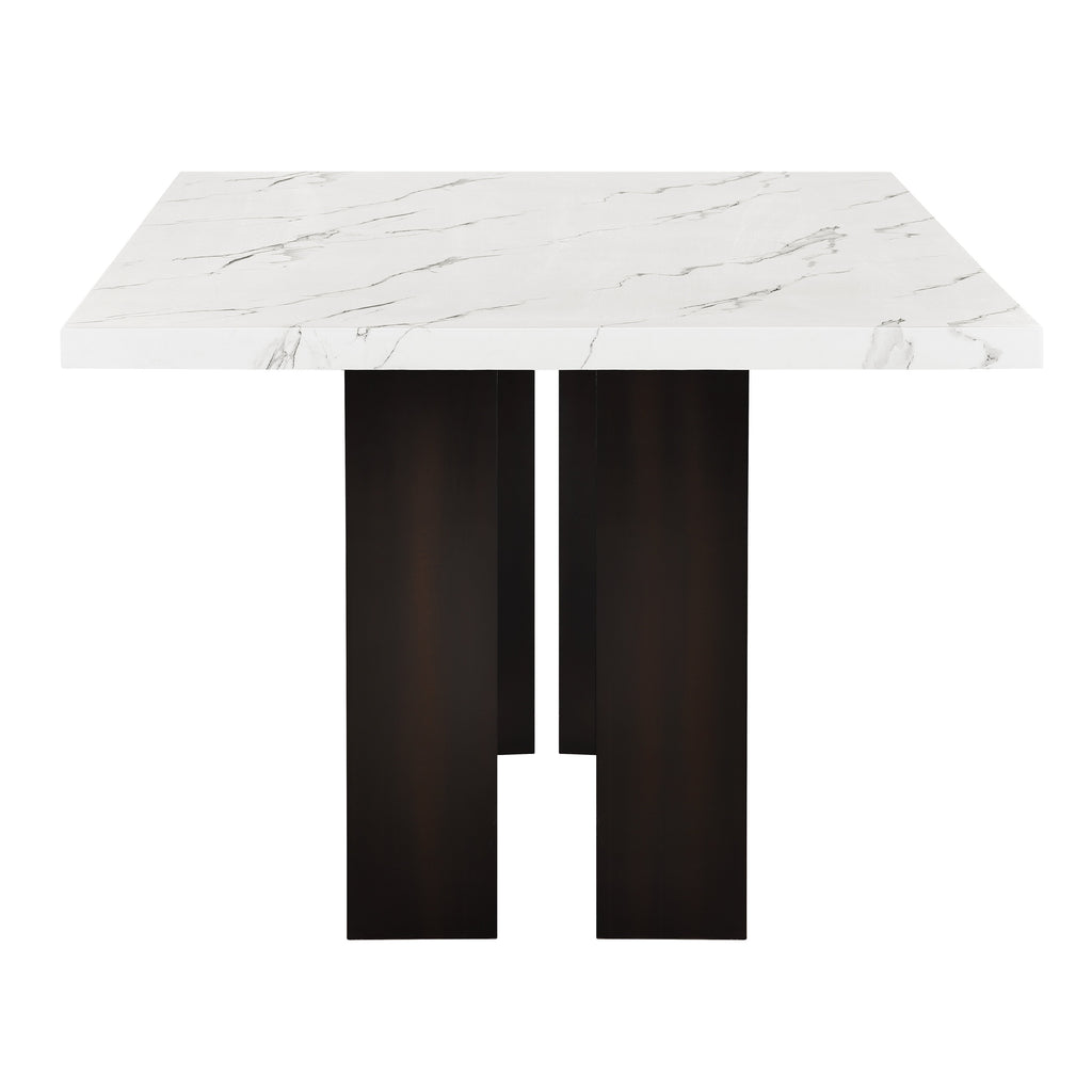 - Contemporary Style: This dining table's sleek white faux marble tabletop with subtle gray veining provides a modern and luxurious aesthetic. The dark pedestal legs offer a bold contrast and add to the table's contemporary appeal.