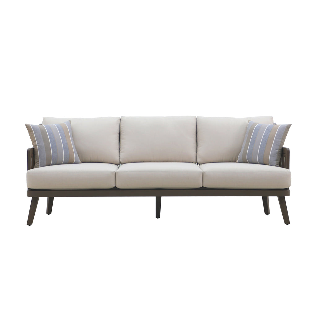 The Genova Patio Sofa with two accent pillows offers a perfect blend of durability, comfort, and style for your outdoor living space. Built with a strong aluminum frame and a baked-on powder coat, this sofa is designed to withstand scratches and ensure long-lasting performance. The eco-friendly, eco-friendly PE wicker provides the timeless look of traditional wicker with the added benefit of being low-maintenance and resistant to water, mildew, and fading. Wrapped in our exclusive Sundura™ fabric, the fade-resistant cushions maintain their vibrant light gray color and are protected against moisture and mildew for all-weather use. Featuring 6” high-density foam cushions, the seating delivers resilient support and comfort for extended relaxation. The contemporary design showcases a sleek, minimalist aesthetic with clean lines and woven rope seat backs, offering an airy feel and strong structural support. A perfect combination of style and function, this sofa will keep your outdoor space looking fresh and inviting season after season.