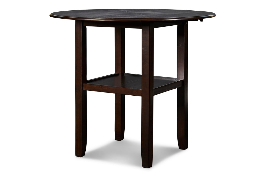 The small space friendly Gia Counter Drop Leaf Table and Chair Set has two 8" drop down leaves that transform this dining table from a 42" round dining set to 24" wide, fitting into compact spaces with ease. The counter table and chair legs are crafted of solid Rubberwood to add strength and stability. Elegant reverse diamond Mindi wood veneer dining table top accents the beautiful wood grains which are highlighted by the multi-step deep dark brown finish with touch of red for richness. The set includes two comfortable counter height chairs with black pu upholstered seat cushions and backrests, and wood footrests. The final touch is Gia's signature interlocking chain design on the chair back, giving this welcoming dining set a touch of sophistication. The result is a casual, contemporary counter dining set that ideal for dining rooms, kitchen nooks, dorms or game rooms.
