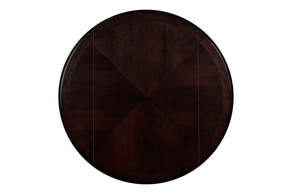 The small space friendly Gia Drop Leaf Dining Table and Chair Set has two 8" drop down leaves that transform this dining table from a 42" round dining set to 24" wide, fitting into compact spaces with ease. The dining table and chair legs are crafted of solid Rubberwood to add strength and stability. Elegant reverse diamond Mindi wood veneer dining table top accents the beautiful wood grains which are highlighted by the multi-step deep dark brown finish with touch of red for richness. The set includes two comfortable dining chairs with black pu upholstered seat cushions and backrests. The final touch is Gia's signature interlocking chain design on the chair back, giving this welcoming dining set a touch of sophistication. The result is a casual, contemporary dining set that ideal for dining rooms, kitchen nooks, dorms or game rooms.