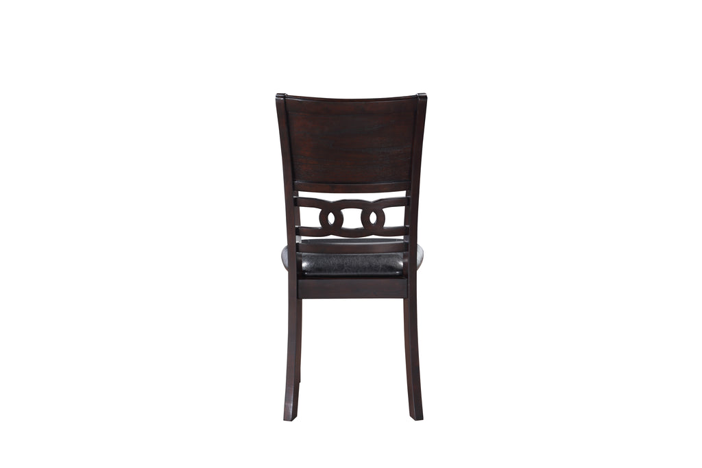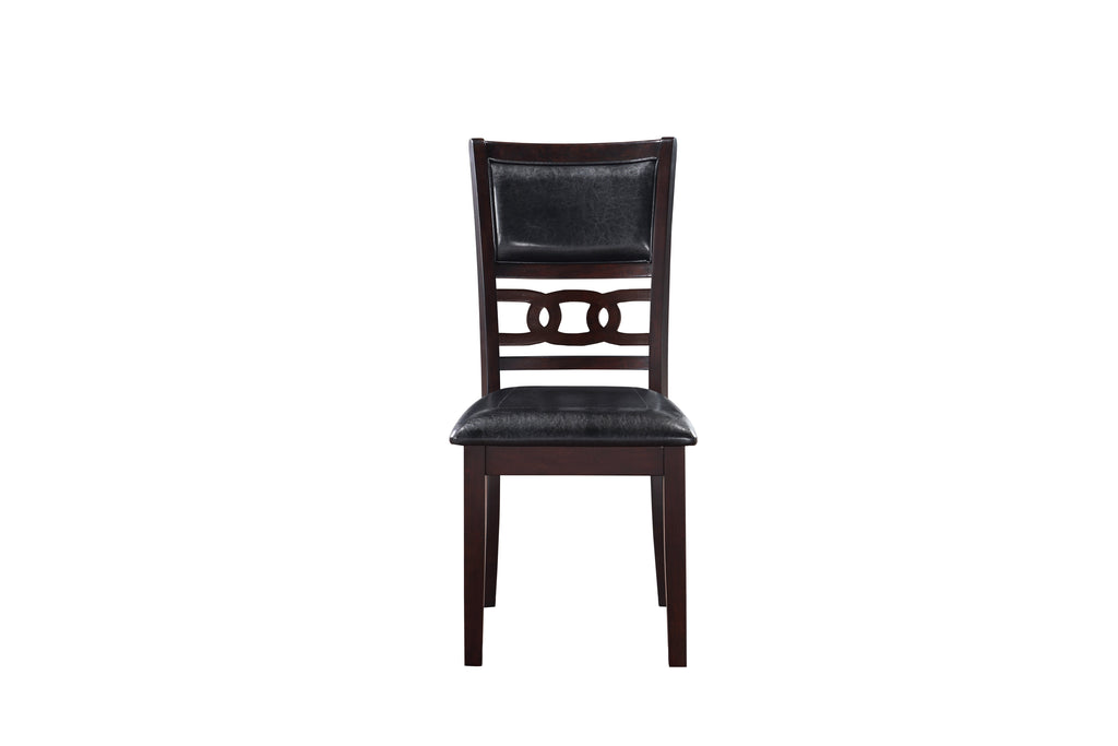 Enhance your dining space with this set of two New Classic Gia Wood Dining Chairs in dark ebony finish. Crafted from solid Rubberwood and Mindi veneers, these chairs offer a perfect blend of durability and aesthetic appeal. The deep ebony finish, achieved through a multistep process and clear coat, highlights the exquisite wood grain. Designed for comfort and longevity, the chairs feature black PU upholstered cushions and backs supported by sturdy solid wood legs. The transitional style, characterized by interlocking chain chair back detail, tapered legs, and clean lines, seamlessly complements any dining room decor. Assembly is a breeze with all necessary hardware and clear instructions included. With a one-year warranty, these dining chairs are a practical and stylish addition to your home. Invest in quality and style with the Gia Wood Dining Chairs.