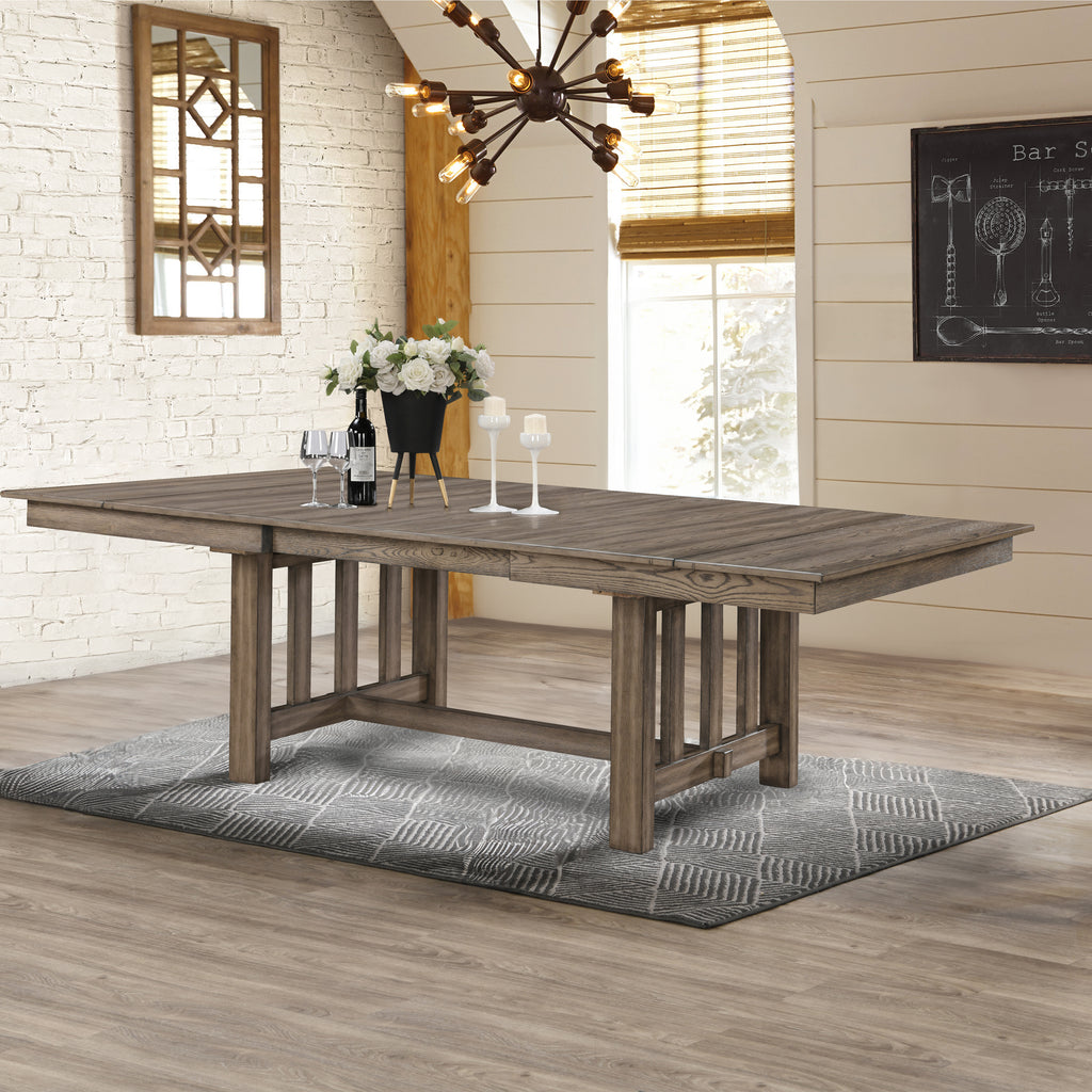 The Harrisburg Dining Table is a testament to classic craftsmanship and thoughtful design, perfect for bringing family and friends together. Constructed from solid rubberwood, manufactured woods, and rich oak veneers, this table is built to last, ensuring it remains a centerpiece in your dining room for years. The table's surface is treated with a multi-step process that includes burnishing and glazing, showcasing the deep, inviting walnut brown hues and revealing the intricate patterns of the wood grain. It features two 14-inch self-storing leaves, seamlessly extending the 66" table to a generous 94", comfortably accommodating 6 to 8 people. The traditional trestle base is a nod to farmhouse, mission, and arts and crafts styles, blending well with both modern and classic interior designs. Whether hosting a dinner party or enjoying everyday meals, the Harrisburg Dining Table offers both functionality and aesthetic appeal.