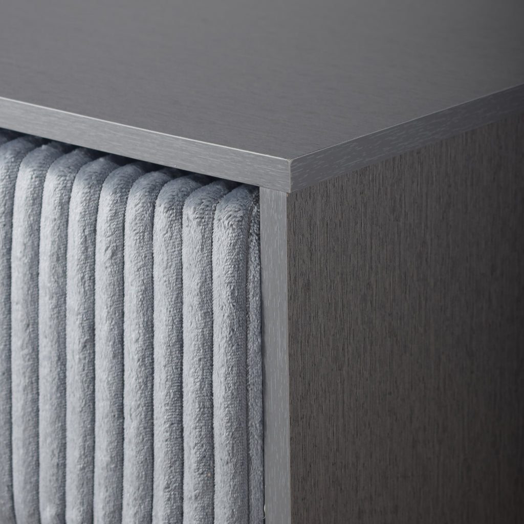 The Kailani 5 Drawer Chest in gray is a perfect blend of modern design, durability, and eco-friendly construction, making it an ideal addition to any bedroom. Expertly crafted from a mix of solid rubberwood, engineered wood, and eco-friendly decorative laminate, this chest offers lasting style and sustainability. The laminate finish not only enhances the chest's appearance but also provides superior resistance to scratches, moisture, and stains, ensuring its beauty with minimal maintenance. The chest features a modern minimalist design with clean lines, a sleek silhouette, and a chic ribbed texture, complemented by slim metallic handles and tapered legs that add both elegance and durability. The drawers, wrapped in luxurious gray 100% Polyester Velvet and accented by chrome pulls, bring a touch of sophisticated glamour to your space. Each drawer is designed for seamless functionality with fully finished interiors, full-extension slides, and dovetail joinery, providing smooth, snag-free storage and lasting strength. The Kailani 5 Drawer Chest combines style, function, and sustainability, making it a standout piece in any modern bedroom.