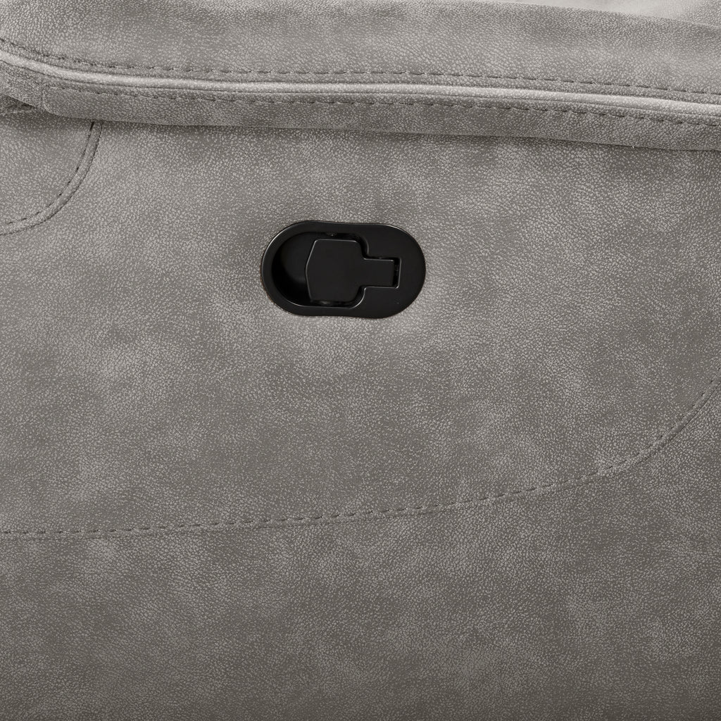 Unwind in style with the Kamari RAF Loveseat with One Recliner in Gray, part of the 3 Piece Kamari Sectional. Crafted for ultimate comfort, this loveseat features suede-like softness in its dappled Gray upholstery, made from a blend of polyester and PU fabric. Its triple roll backs, bucket seats, and wrap-around arms, adorned with tasteful contrasting welt, elevate its sophisticated style. Fully upholstered chaise recliner footrest offers luxurious relaxation, while hardwood and manufactured wood frames, along with coil spring cushions wrapped in resilient foam and polyester, ensure enduring support. Versatile in design, this loveseat complements both contemporary and traditional decor, making it a perfect addition to any living space. Pair it with the matching Wedge and Left Arm Facing Loveseat for a complete sectional setup that's tailored to perfection.