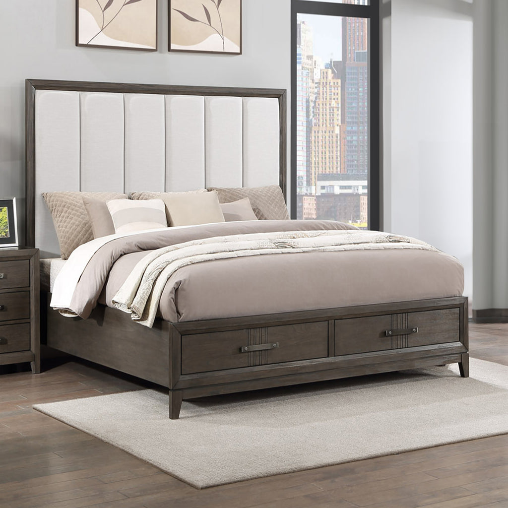 The Landon Storage Platform Bed combines durability, style, and practicality to enhance any modern bedroom. Expertly crafted from solid Pine, high-quality engineered woods, and genuine Mindi wood veneers, this bed is built to last while preserving the natural beauty of wood with its multi-step walnut finish and subtle gray undertones. The plush, channeled-back headboard, upholstered in natural fabric, offers cozy relaxation and a refined contrast to the bed’s warm tones. For added convenience, the storage footboard includes two spacious drawers, ideal for stowing away linens, clothing, or other essentials. Designed with modern living in mind, the platform bed features 13 sturdy support slats that provide reliable mattress support without the need for a box spring, ensuring a sleek, low-profile appearance. The Landon Storage Bed is a perfect blend of style and function, making it an excellent addition to any bedroom.