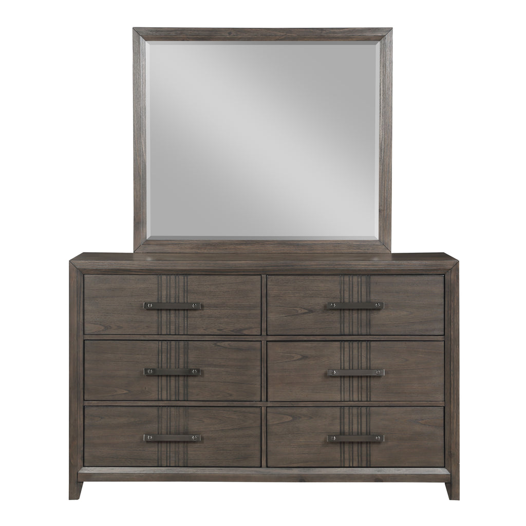 The Landon Dresser Mirror in Brown offers a perfect blend of durability, style, and functionality, making it a refined addition to any bedroom. Expertly crafted from solid Pine, high-quality engineered woods, and genuine Mindi wood veneers, this mirror is built to last while preserving the natural beauty of wood with its multi-step walnut finish and subtle gray undertones. The mirror's sleek design features picture frame moldings that elegantly encase crystal-clear, low-distortion beveled glass, ensuring a flawless reflection. This piece not only enhances the aesthetic appeal of your space but also provides impeccable functionality, adding a touch of sophistication to any room.