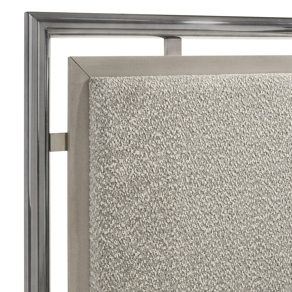 - Lustrous Details: The furniture features a specialty metallic finish over wood that mimics the modern, polished look of stainless steel while offering exceptional durability and scratch resistance. It enhances the light gray finish, adding a sleek, sophisticated touch ideal for a contemporary ambiance.