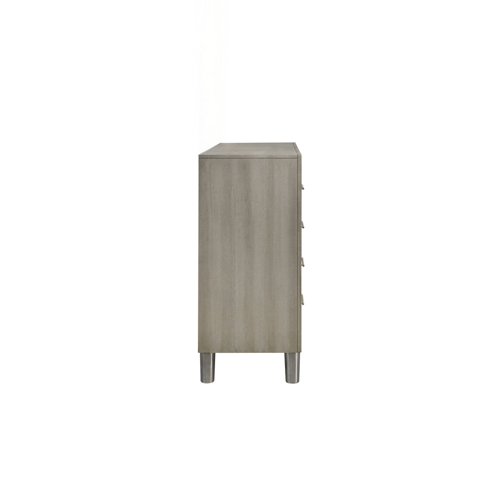 - Lustrous Details: The furniture features a specialty metallic finish over wood that mimics the modern, polished look of stainless steel while offering exceptional durability and scratch resistance. It enhances the light gray finish, adding a sleek, sophisticated touch ideal for a contemporary ambiance.