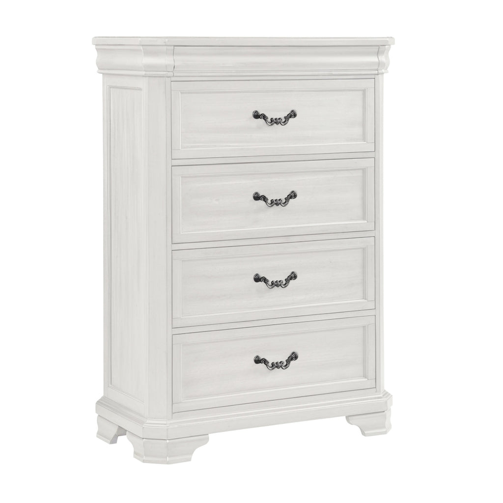 - Vintage White Finish: The heirloom finish is achieved through a multi-step process that includes mild distressing, burnishing, and gray glazing that enhances the natural beauty of the wood.