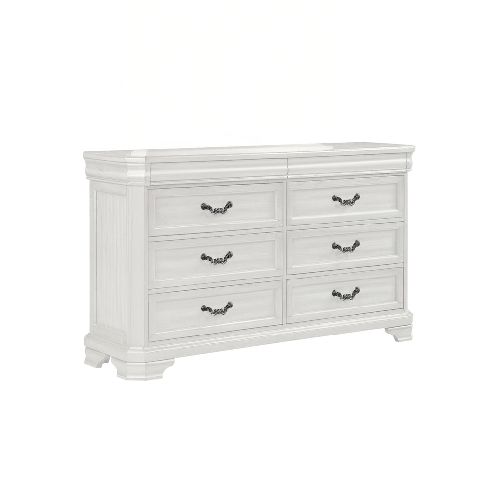Introducing the Lyndhurst Dresser in Vintage White—a blend of timeless elegance and practical functionality. Crafted from solid Acacia, Acacia veneers, and manufactured wood, this dresser ensures enduring strength and durability. Its heirloom white finish, achieved through a meticulous multi-step process, enhances the wood's natural beauty with subtle distressing, burnishing, and light gray glazing. Substantial moldings, bracket feet, and ornate hardware define its masterful style, making it a standout piece in any bedroom. Inside, the dresser boasts six spacious drawers crafted with English dovetail joinery, full extension drawer glides, and finished interiors, ensuring smooth operation and ample storage for clothing. Two discreet velvet-lined drawers are concealed behind top moldings, providing a luxurious touch for delicate items. Additionally, bottom drawers are cedar-lined, offering optimal storage for sweaters. Elevate your bedroom decor with the stately sophistication of the Lyndhurst Dresser.