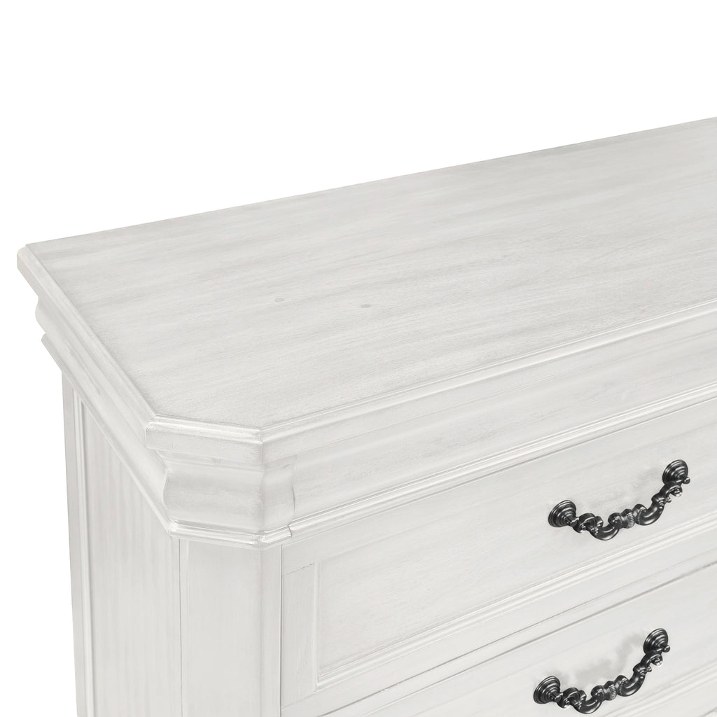 - Vintage White Finish: The heirloom finish is achieved through a multi-step process that includes mild distressing, burnishing, and gray glazing that enhances the natural beauty of the wood.