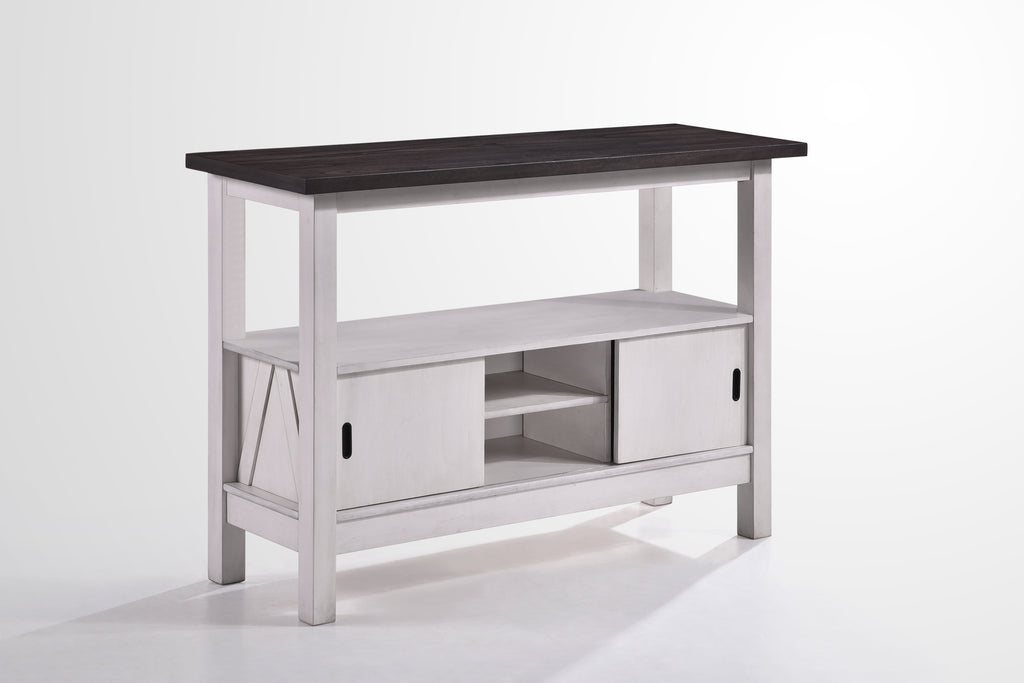 - Rustic, Farmhouse Finish: The Server has a dark brown top with a smooth finish, providing a modern contrast to the rustic design. The cabinet base is painted white and slightly distressed, enhancing the farmhouse appeal and adding character.