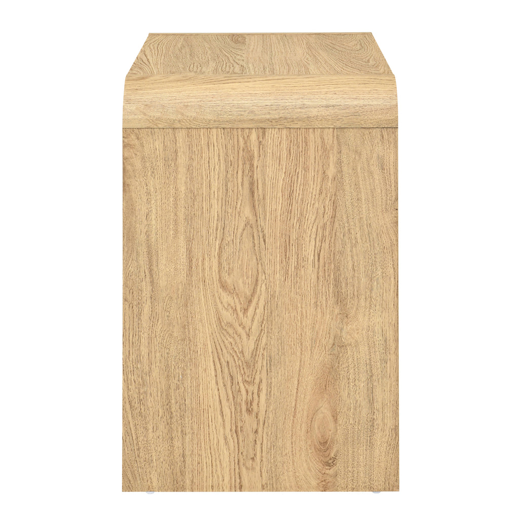Introducing the Mara Two Drawer End Table, a testament to eco-friendly craftsmanship and modern design. Crafted from durable manufactured wood and adorned with environmentally friendly laminate, this end table offers both style and sustainability. Its ample surface area provides space for lamps and accessories, while the two storage drawers keep remotes and reading materials neatly out of sight. The minimalist design, accentuated by curved drawer fronts and waterfall-style tops and sides, adds a touch of contemporary elegance to any room. Finished in a light, natural beige hue, it effortlessly complements a variety of décors, making it a versatile choice for your home.