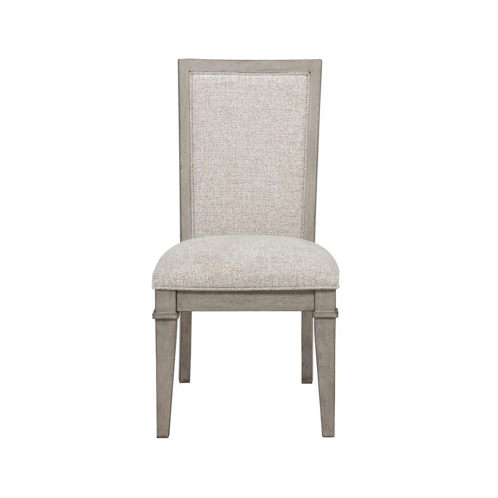 The Mariana Upholstered Side Chairs in Vintage Crème, sold as a set of two, are crafted from solid Rubberwood, premium manufactured woods, and Acacia wood veneers, offering both beauty and durability. Each chair is meticulously finished in a vintage crème, with hand-distressed details like rasping and clefting that give it a distinctive, time-worn character. Designed for comfort, the chairs feature high-density foam cushions and are upholstered in soft, premium 100% polyester fabric, providing a comfortable seating experience ideal for long meals and gatherings. The sleek silhouette, paired with a tall, upholstered backrest, combines sophistication with exceptional support, making these chairs a stylish yet functional addition to any dining space.