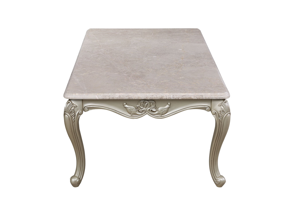The Monique Royal Classic Cocktail Table in champagne epitomizes heirloom-quality craftsmanship and timeless elegance. Expertly constructed from premium pine solids and adorned with durable polyurethane carvings, this coffee table is lightweight, moisture-resistant, and pest-resistant, ensuring long-lasting beauty and functionality. The luxurious, beveled, and gracefully contoured genuine marble top offers a sophisticated look with superior scratch and water resistance. Featuring traditional Rococo style, the table showcases ornate details, gracefully curved legs, and intricate carvings, embodying the elegance and fine craftsmanship of Rococo design. This cocktail table is a standout addition to any traditional or opulent decor setting, promising to enhance your living space with its refined style and enduring charm.
