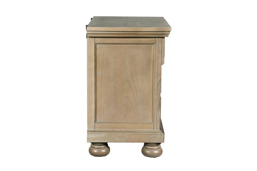 The Allegra 3 Drawer Nightstand in a refined pale pewter finish offers the perfect blend of durability, style, and modern convenience. Expertly crafted from solid Mindi wood, engineered woods, and wood veneers, this nightstand showcases the natural beauty of Mindi's rich grain while providing exceptional durability and resistance to decay. The meticulous multi-step finish, enhanced by a delicate brush treatment and subtle white hang-up effect, adds depth and character to the piece, making it a timeless addition to any bedroom. The transitional design seamlessly fits both traditional and contemporary interiors, with clean lines and subtle curves that add a touch of modern sophistication. Built with heirloom craftsmanship, the drawer construction features four-corner English dovetail joints for strength and durability, along with smooth-rolling full-extension glides for easy access. The fully finished interiors protect your belongings, while the thoughtfully designed hidden storage drawer offers an extra layer of security for your valuables. For added functionality, the nightstand includes convenient USB charging ports mounted on the back, ensuring your devices stay powered up and within reach. The Allegra 3 Drawer Nightstand is an excellent choice for those seeking a stylish, durable, and practical bedside solution.