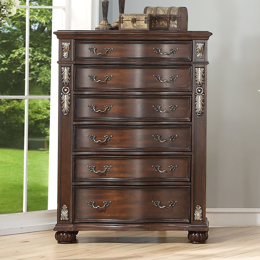 The Royal Classics Maximus 6-Drawer Chest in Madeira Brown is a masterfully crafted piece that blends enduring quality with timeless elegance. Constructed from solid poplar and premium birch veneers, this chest is built to last, offering heirloom-quality durability and beauty for years to come. The multi-step finish enhances the rich, natural grain of the wood, while delicately burnished gold tipping highlights the intricate Baroque-inspired carvings, adding a luxurious touch to the overall design. Each drawer is crafted with French and English dovetail joinery for exceptional strength and glides smoothly on full-extension tracks, providing effortless access to your belongings. The impeccably finished interiors ensure snag-free storage, while the velvet-lined top drawers add a layer of refined sophistication. This chest combines classic design with modern functionality, making it a perfect addition to any elegant bedroom.