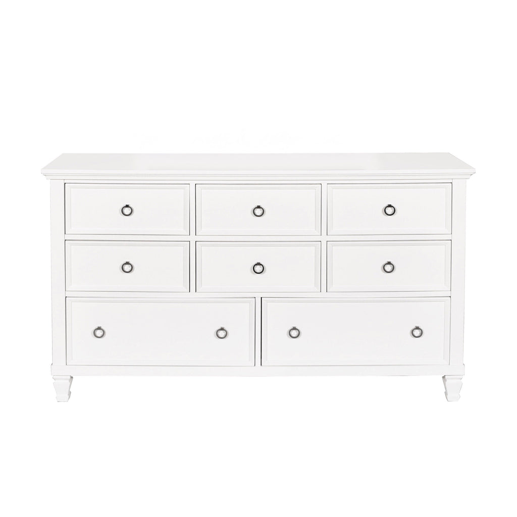 The Tamarack 8 Drawer Wood Dresser in white offers a perfect blend of durability and style. Built with a combination of solid poplar, basswood veneers, and eco-friendly manufactured wood, this dresser ensures strength and long-lasting durability. Its versatile transitional design combines contemporary clean lines with classic paneled detailing, seamlessly blending modern and traditional aesthetics. The elegant white finish adds a touch of sophistication and modernity, enhancing the overall aesthetic and complementing any decor style. Quality drawer construction guarantees smooth operation with side-mounted glides and the durability of English dovetail joinery on both the front and back, ensuring long-lasting use. Fully finished drawers provide snag-free storage, while the felt-lined top drawers protect your delicates. This dresser is an excellent addition to any bedroom, offering both style and functionality.