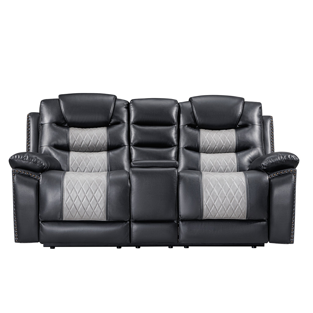 Experience the ultimate in comfort and convenience with the Nikko Dual Recliner Storage Console Loveseat with Power Footrests and Hidden Cupholders . This loveseat features long-lasting construction with frames crafted from hardwoods and plywood, ensuring a stable and durable seating experience. Enjoy luxurious, cozy lounging with resilient foam cushions and pocket coil support. The two-tone black and gray fabric, made from a blend of 80% polyester and 20% PU, offers the soft touch and look of leather while remaining breathable. With distinctive details like nailhead trim, diamond stitch pattern seats, double wrapped headrests, and expert tailoring, this loveseat adds a touch of elegance to any home. Practical lifestyle features include extra storage in the center console, hidden pull-out cupholders under the armrests, and USB charging ports to keep your devices powered up. Plush pillowed arm and headrests, reclining backs, and comfortable footrests provide the perfect place to unwind. Find your ideal recline position with the touch of a power button. Upgrade your living space with the Nikko Dual Recliner Storage Console Loveseat and enjoy unparalleled comfort and style in your home.