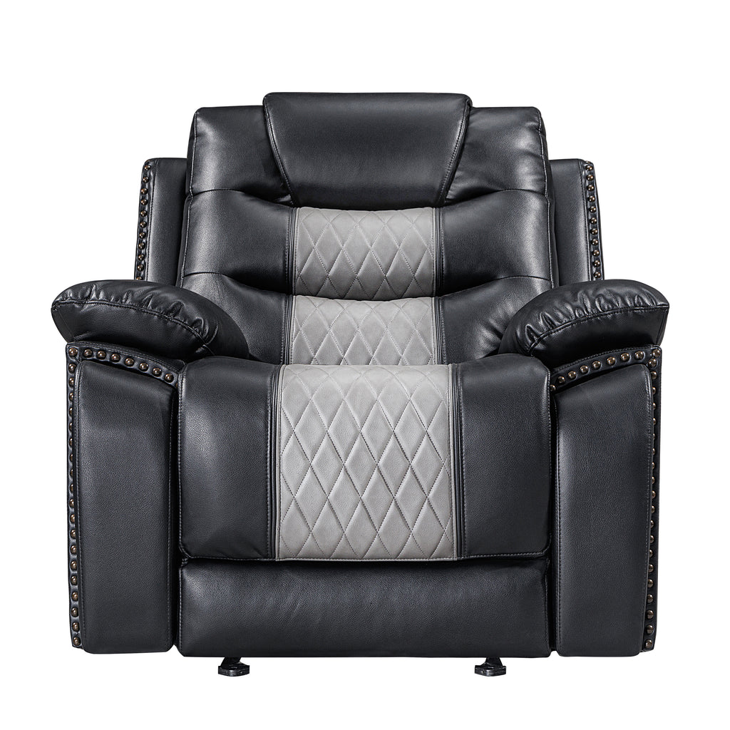Experience unparalleled comfort with the Nikko Glider Recliner with Hidden Cup Holders . This recliner is built with long-lasting construction, featuring frames crafted from hardwoods and plywood for a stable and durable seating experience. Enjoy luxurious seating with resilient foam cushions and pocket coil support, offering a cozy place to lounge. The two-tone black and gray fabric, made from 80% polyester and 20% PU, provides the soft touch and look of leather with added breathability. Distinctive details such as nailhead trim, diamond stitch pattern seats, double wrapped headrests, and expert tailoring make this recliner a standout addition to any home. Practical lifestyle features include conveniently placed hidden cupholders in discreet pullout compartments under the armrests. The glider recliner offers soothing, gentle gliding action, plush pillowed arm and headrests, reclining backs, and comfortable footrests, providing the ultimate place to unwind. Enjoy unparalleled comfort and style in your home with the Nikko Recliner.