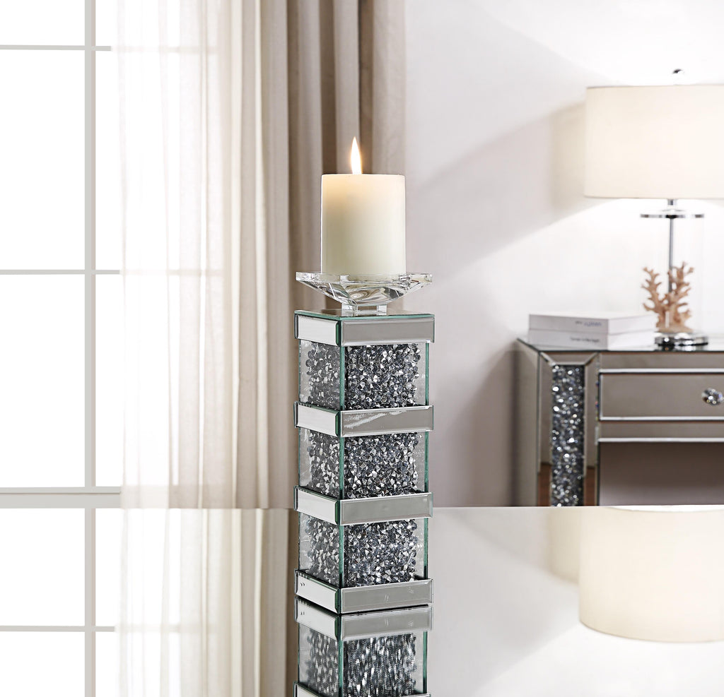 ACME Noralie Accent Candleholder (Set-2), Mirrored & Faux Diamonds, 4" x 4" x 13"H, 10lbs. Cast a warm glow over any space in your home with this Noralie candleholder. More than stylish, this piece will bring sophistication to your home with its mirrors and faux gem inlay. This gleaming piece comes in two different sizes to choose the one that complements your decor. Features: - Candleholder - Features: Beveled Mirrored Finish w/Faux Diamonds Inlay, 4mm Clear Tempered Glass - 2Pc Set Materials: Mirror, Glass, Faux Crystals, Composite Wood