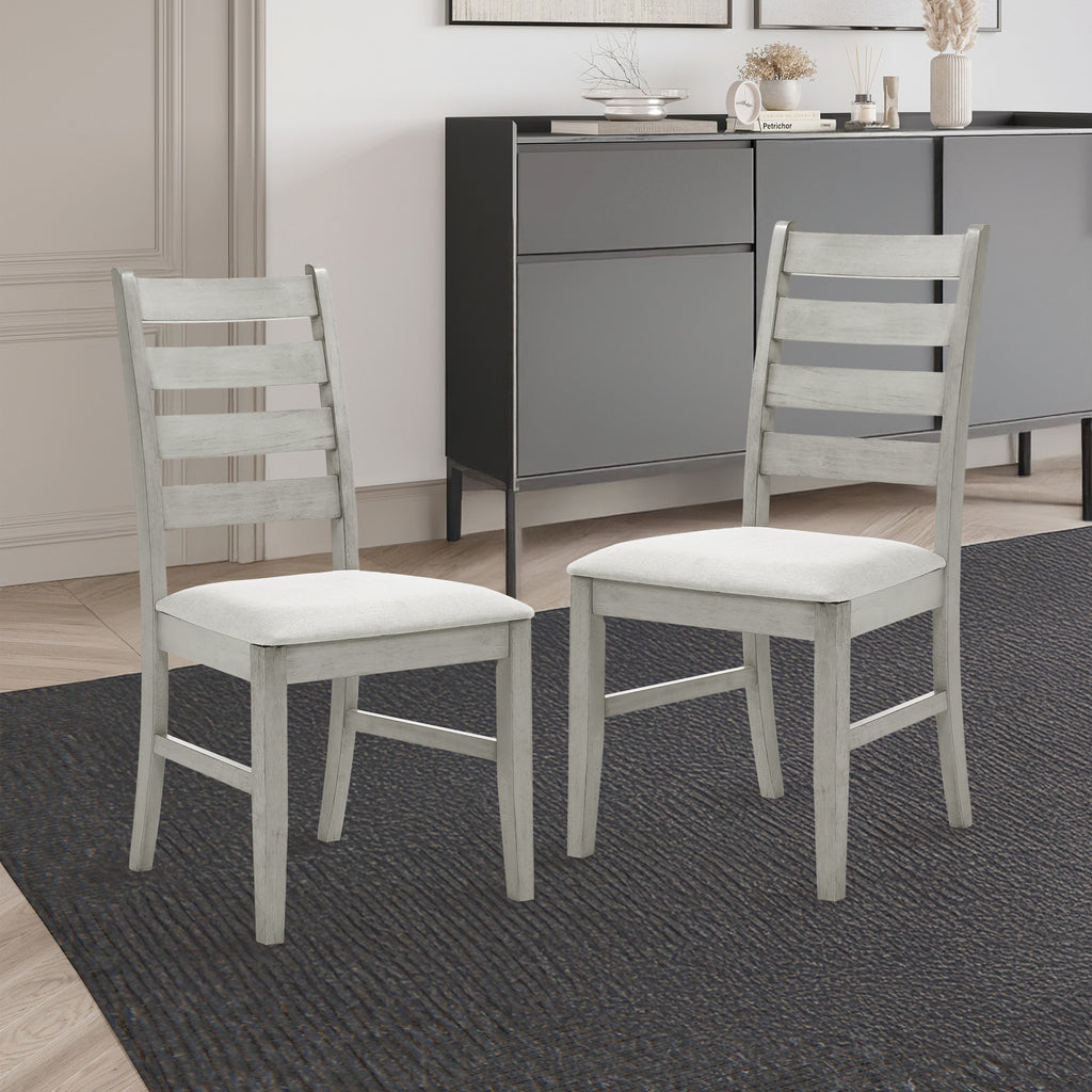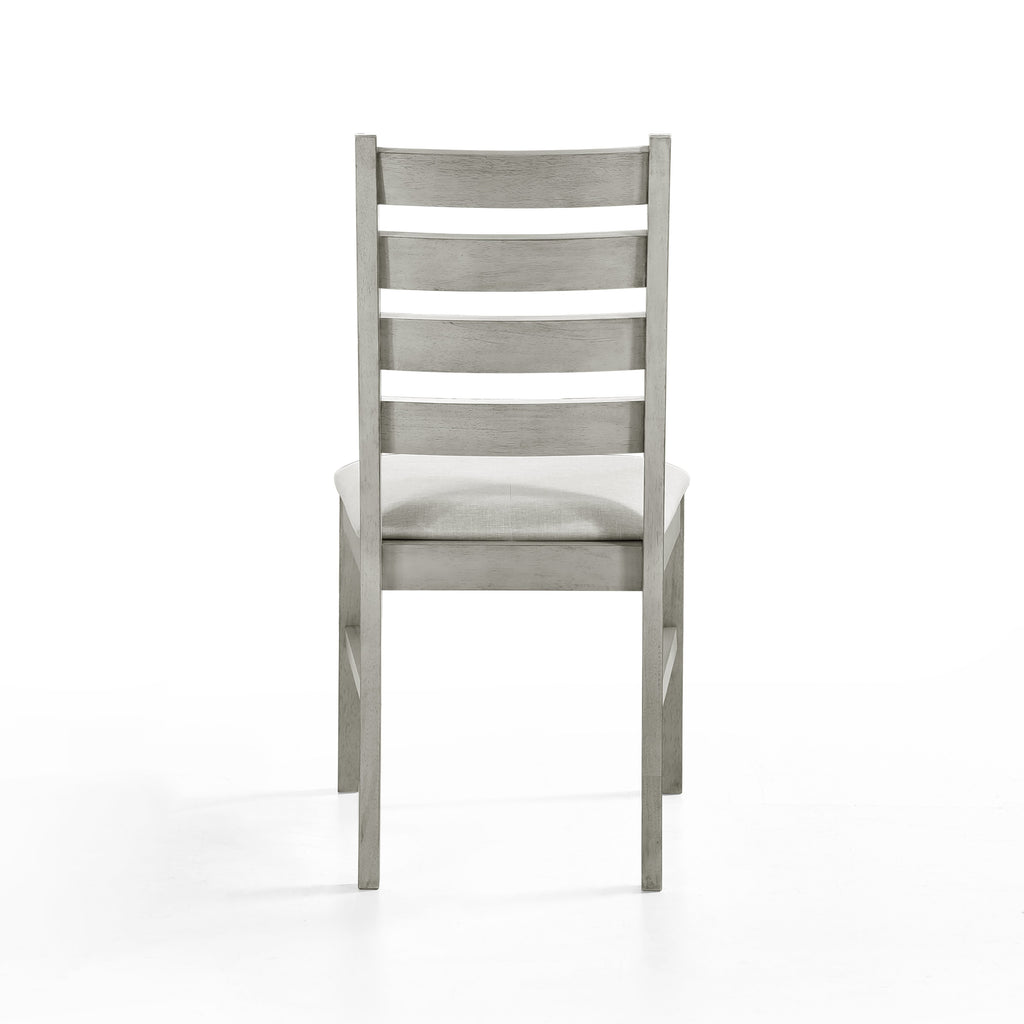Enhance your dining experience with the Pascal Ladderback Dining Chairs in Driftwood Gray. This set of two chairs is crafted from solid Rubberwood, ensuring long-lasting durability and stability. The chairs feature side stretchers for added strength, making them a reliable choice for everyday use. The light, sophisticated finish is achieved through a meticulous multi-step process, including rub-throughs and glazing, which highlight the natural beauty of the wood. Each chair offers a comfortable seating experience with high-density foam cushions covered in easy-care 100% polyester fabric. Designed with versatility in mind, the Pascal Ladderback Dining Chairs boast subtly rounded edges, tapered legs, and an elegant ladderback style. These features create an upscale look that seamlessly fits into transitional, farmhouse, and contemporary decor styles. Combining quality craftsmanship with timeless design, these chairs are a perfect addition to any dining space.