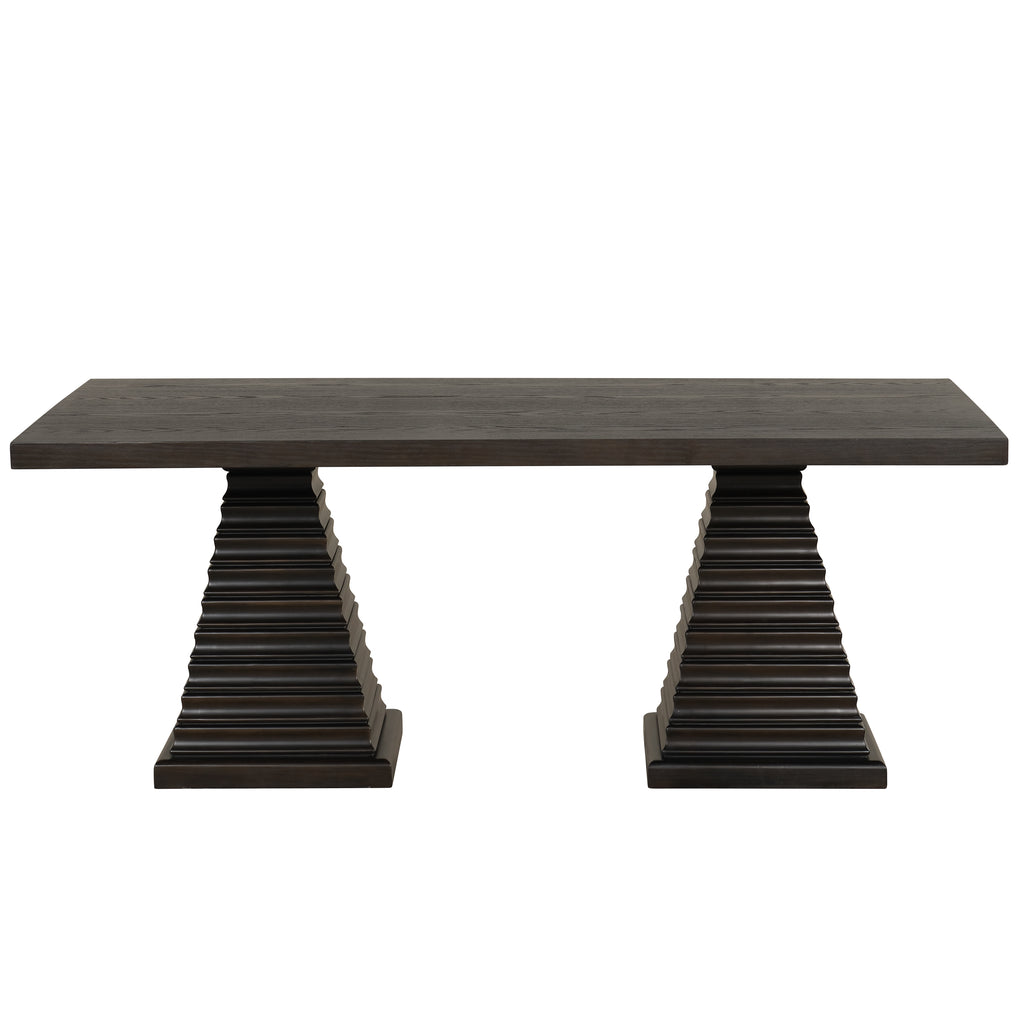 The Plateau Dining Table blends lasting quality with refined rustic style. Crafted from solid Rubberwood and engineered wood with Oak veneers, it features a rich multi-step espresso finish and heirloom-style distressing. Bold geometric lines and a double pedestal base add modern charm. The 78" surface comfortably seats up to 8, making it perfect for family meals and celebrations. A timeless centerpiece built for durability, beauty, and everyday living.