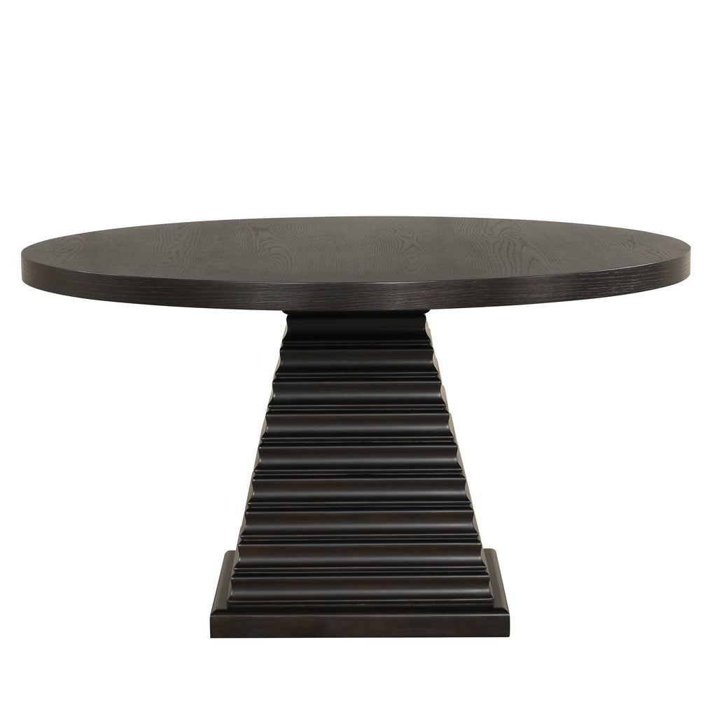 The Plateau 54" Round Dining Table offers timeless style and everyday durability. Crafted from solid Rubberwood and Oak veneers, it features a rich espresso finish with heirloom-style distressing. The bold pedestal base and geometric lines blend rustic charm with modern appeal. Perfect for both casual meals and special occasions, the spacious round top comfortably seats four—creating a warm, inviting setting for gathering and dining.