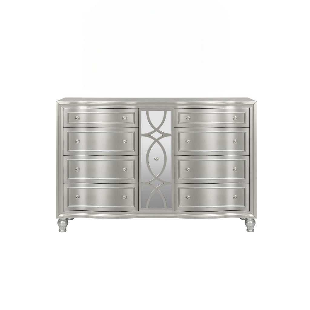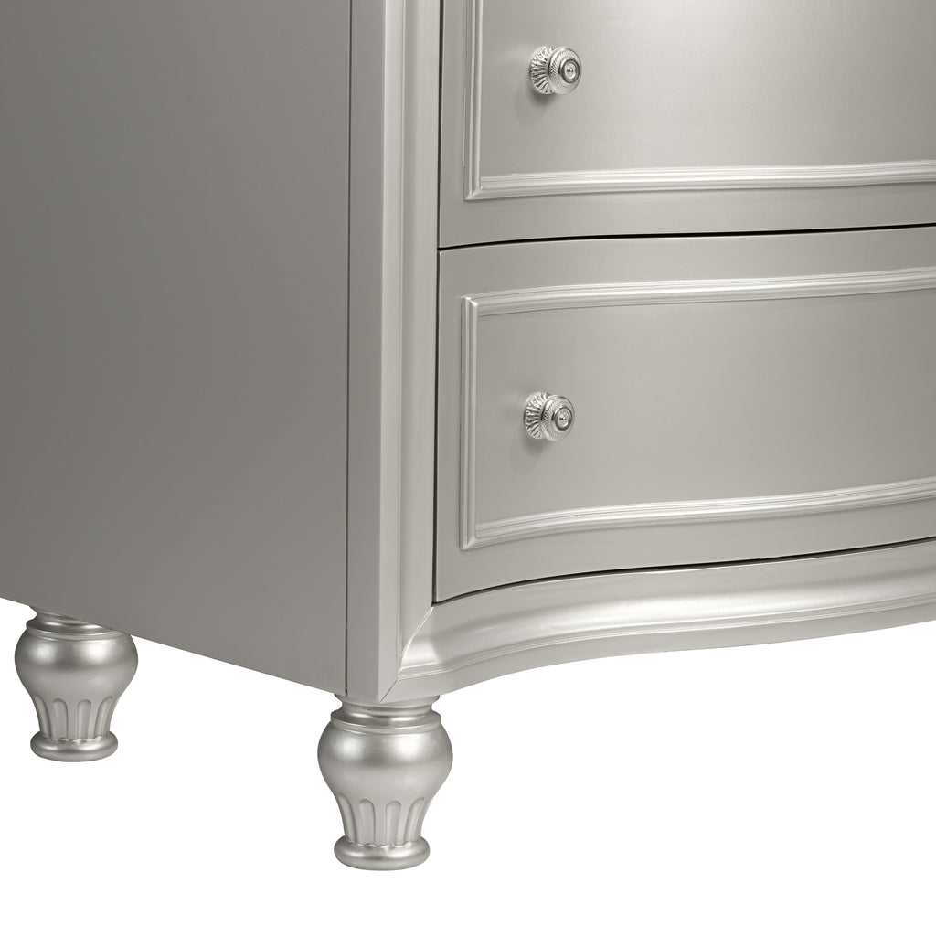 - Glamorous Matte Silver Finish: This luxurious finish not only adds a radiant touch of elegance but also beautifully complements the mirrored panels and shimmering silver drawer pulls, creating a refined and sophisticated look.