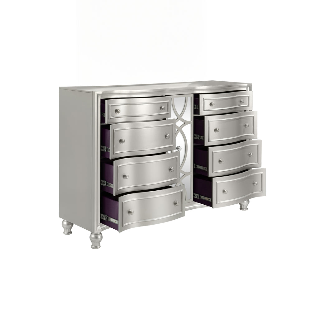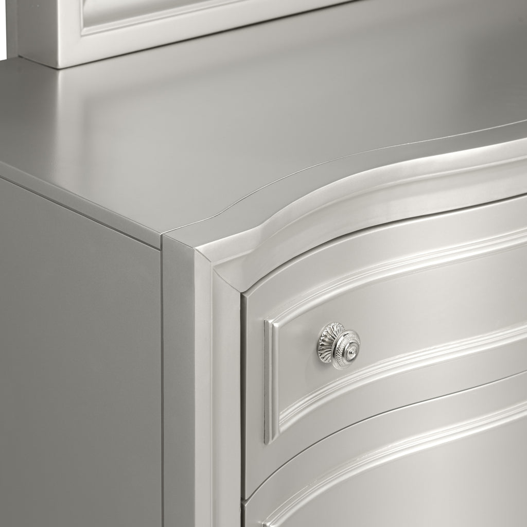 Discover the Reflection Dresser in Silver, meticulously crafted from solid Pine and high-quality manufactured wood to ensure enduring strength and durability. Its glamorous matte silver finish exudes sophistication, reflecting the mirrored panel and silver drawer pulls of the 8-drawer dresser, adding an elegant touch to any bedroom decor. Experience luxurious functionality with bowfront drawers, sumptuous lavender velvet linings, picture frame moldings, and turned bun feet, seamlessly blending classic charm with modern flair. Inside, find meticulous craftsmanship with English dovetail joinery, full extension drawer glides, finished interiors, and select velvet-lined drawers to safeguard delicate items. Enjoy extra upgrades such as the mirrored panel hidden center compartment that pulls out to reveal velvet-lined storage and jewelry hooks, as well as cedar lining in the bottom drawers for sweater storage. This dresser is not just a piece of furniture—it's a marvel of design and practicality, destined to enhance your bedroom space with style and functionality.