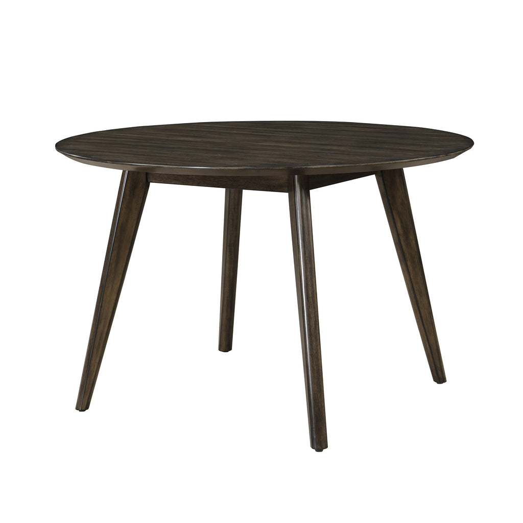 The Rex Mid-Century Modern 48" Round Dining Table in Walnut offers a stylish and practical solution for small space dining. This table, crafted from solid rubberwood, manufactured woods, and oak veneers, ensures exceptional stability and longevity. Its classic mid-century modern design features a minimalist aesthetic with neutral tones, clean lines, rounded edges, and angled, tapered legs, capturing timeless elegance. The multi-step walnut brown finish, hand-rubbed with a clear topcoat, enhances the natural beauty of the wood grain. Perfect for smaller dining areas, this round dining table provides comfortable and stylish seating for four.