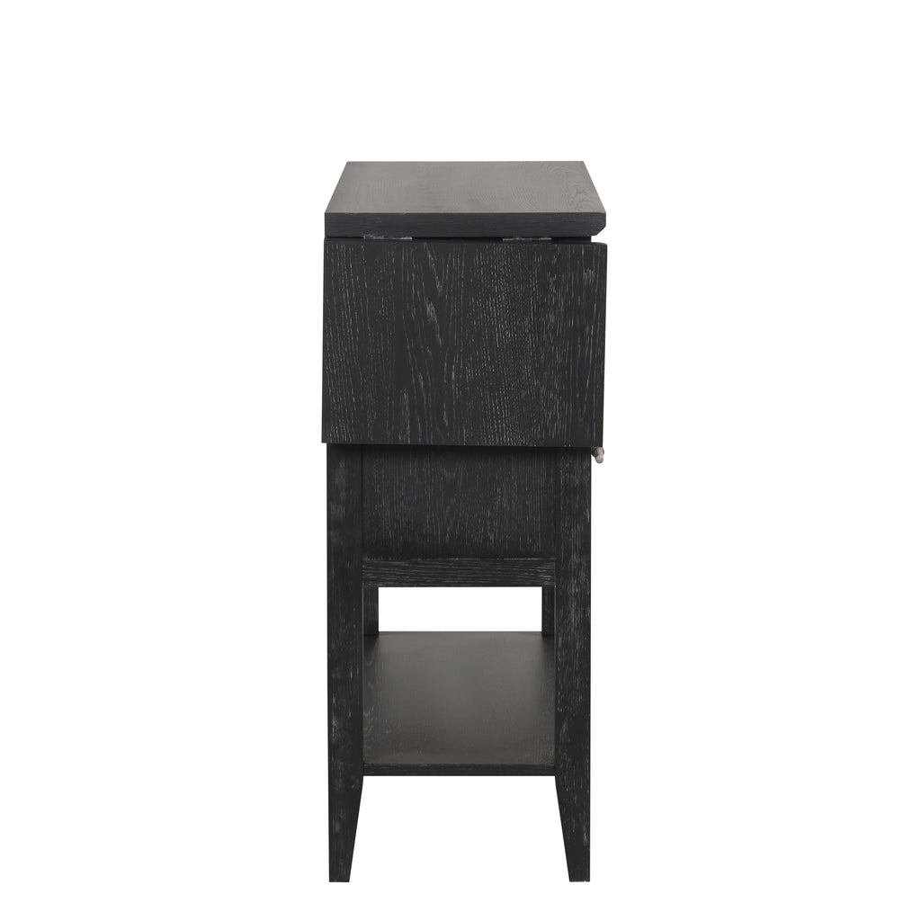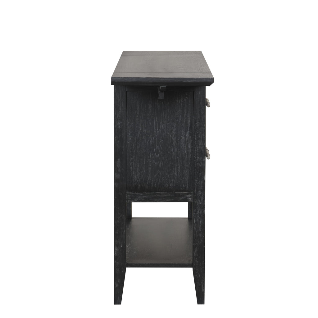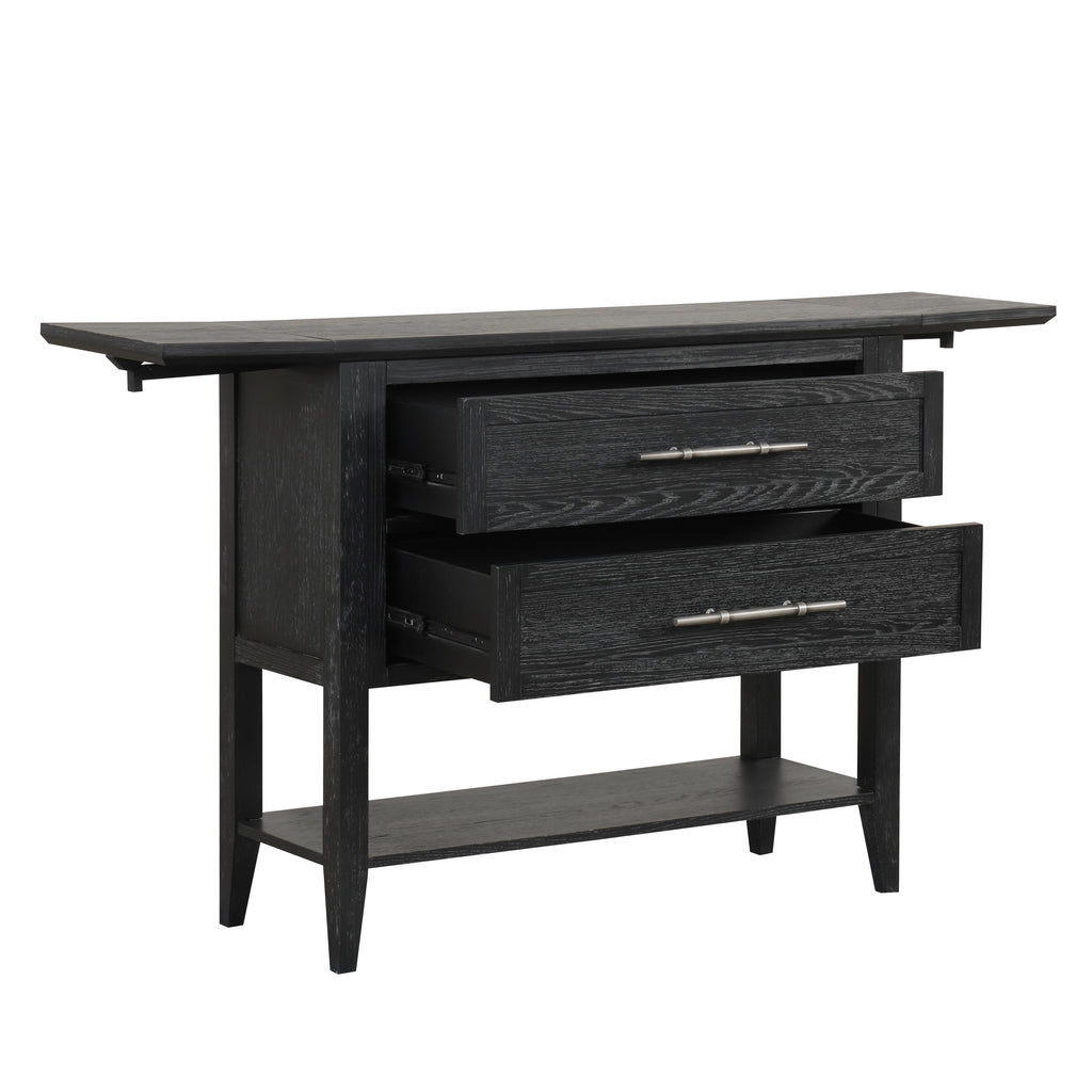 The Sable Crest Drop Leaf Server is a versatile and durable piece designed to enhance both the style and functionality of your dining space. Built from solid Rubberwood and premium engineered woods, and finished with real Oak wood veneers, it offers the lasting strength of real wood combined with enduring beauty. The sophisticated ebony sable finish, applied through a meticulous multi-step brush technique, highlights the natural grain and unique characteristics of the wood, adding depth to your dining area. The transitional design blends contemporary clean lines with subtle farmhouse charm, making it suitable for a variety of interior styles. This server is not only stylish but also highly functional, featuring two spacious storage drawers, an open shelf for easy access, and an extendable leaf that transforms it into a convenient buffet server. Its compact size and adaptable design make it perfect for use in entryways and hallways as well, offering a practical and attractive solution for any space that needs a touch of both style and utility.