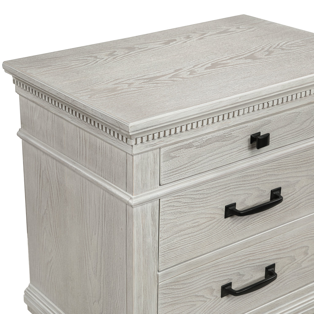 The Silver Sands Nightstand is a marvel of durable, quality construction, crafted from solid pine, manufactured woods, and Oak wood veneers, ensuring strength and stability. This versatile piece embodies transitional style, blending clean, simple lines with a rustic wood finish for a calm, inviting atmosphere. The misty gray finish, applied through a meticulous multi-step process, showcases the wood's natural grain and mineral patterns with a light, weathered look. Elegant design elements, such as the raised base, full return and dentil moldings, and contrasting hardware, lend a sophisticated appeal. Heirloom-quality drawers with durable dovetail joinery and three-stage steel ball glides provide smooth, full-extension operation and support for heavy loads. With three spacious drawers, including a velvet-lined top drawer for delicate items, this nightstand offers ample storage and functionality. A perfect addition to any bedroom, combining style, durability, and practicality.