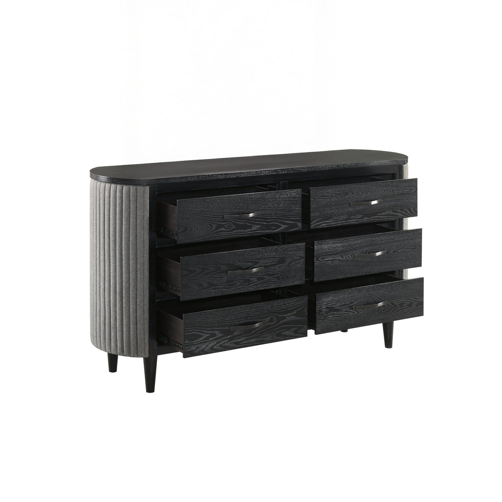 The Skyline 6-Drawer Dresser in Onyx blends modern design with functionality, making it a statement piece. Built from solid Rubberwood, engineered woods, and Ash veneers, it’s sleek and durable. The Onyx Black finish with gray glazing enhances the wood grain for a luxe look. Textured gray ribbed fabric contrasts beautifully with the dark wood. Six spacious drawers with ball-bearing glides and dovetail joinery offer smooth storage. Velvet-lined top drawers add a refined touch of elegance and practicality.