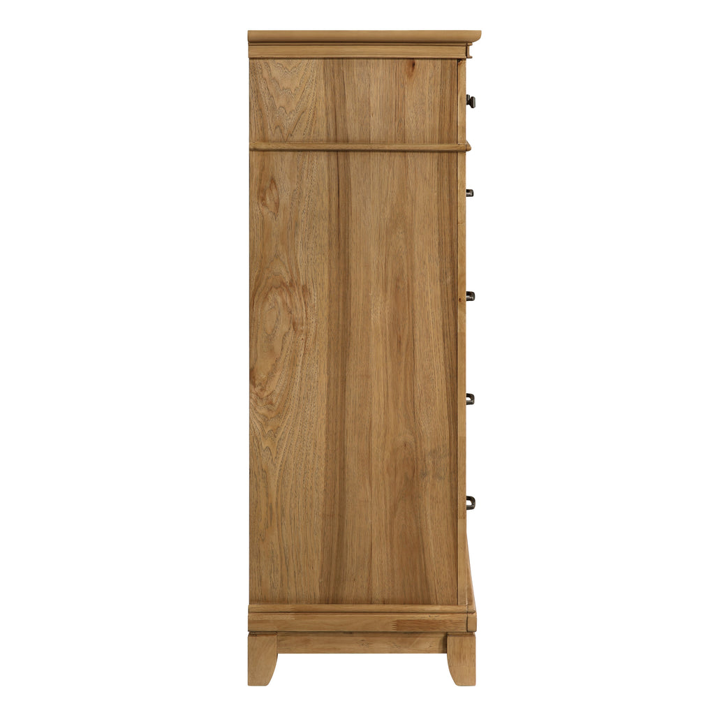 The Sunstone Chest combines durable, quality construction with solid rubberwood, manufactured woods, and hickory wood veneers, creating a strong and stable five-drawer chest. This collection features a classic, rustic style with natural wood finishes and clean, simple lines, complemented by neutral tones and a minimalistic design that fosters a serene and inviting atmosphere. The clear, natural finish, achieved through a hand-applied stain, enhances the wood's grain patterns and characteristics. The chest's elegant design includes a raised base, full return moldings, and contrasting hardware, adding a sophisticated touch to any bedroom. Heirloom drawer quality is ensured with durable dovetail joinery, providing longevity and strength, while three-stage steel ball glides allow for smooth, full-extension operation and support for heavy loads. Functional extras include five spacious drawers for ample clothing storage and a velvet-lined top drawer to protect delicate items. The Sunstone Chest is a practical and stylish addition, offering both timeless design and optimal functionality for your bedroom.