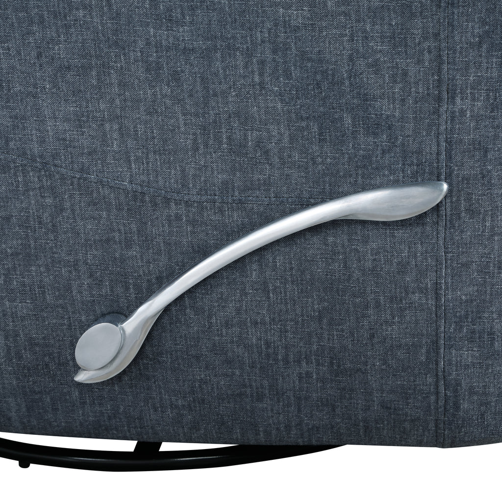 The Takami Swivel Recliner in blue offers a perfect blend of comfort, durability, and style for your living space. Expertly crafted with a hardwood and plywood frame, it provides exceptional strength and stability, ensuring it stands the test of time. High-density foam and coil seat cushions, paired with a plush foam and feather blend back, deliver unbeatable comfort and support. Upholstered in 100% polyester fabric, this recliner combines the rich, warm feel of blue with the durability you need for everyday use, staying fresh for years to come. Enjoy the flexibility of effortlessly swiveling for engaging conversations or reclining for complete relaxation. The adjustable headrest allows you to personalize your comfort for the perfect seating experience. With its sleek silver recliner pull, tailored lines, and triple rolled back design, the Takami Swivel Recliner blends contemporary flair with a transitional appeal, making it a versatile addition to any room.