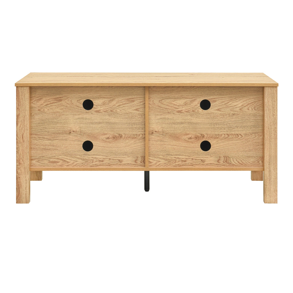 The Thayer 47" TV Console offers stylish storage with a modern organic touch. Crafted from eco-friendly wood in a natural oak finish, it features clean lines, vertical reeded detailing, and rich woodgrain texture. Behind two doors, adjustable shelving and rear cable cutouts provide organized space for electronics, media, and gaming gear—perfect for keeping your entertainment area tidy and streamlined.